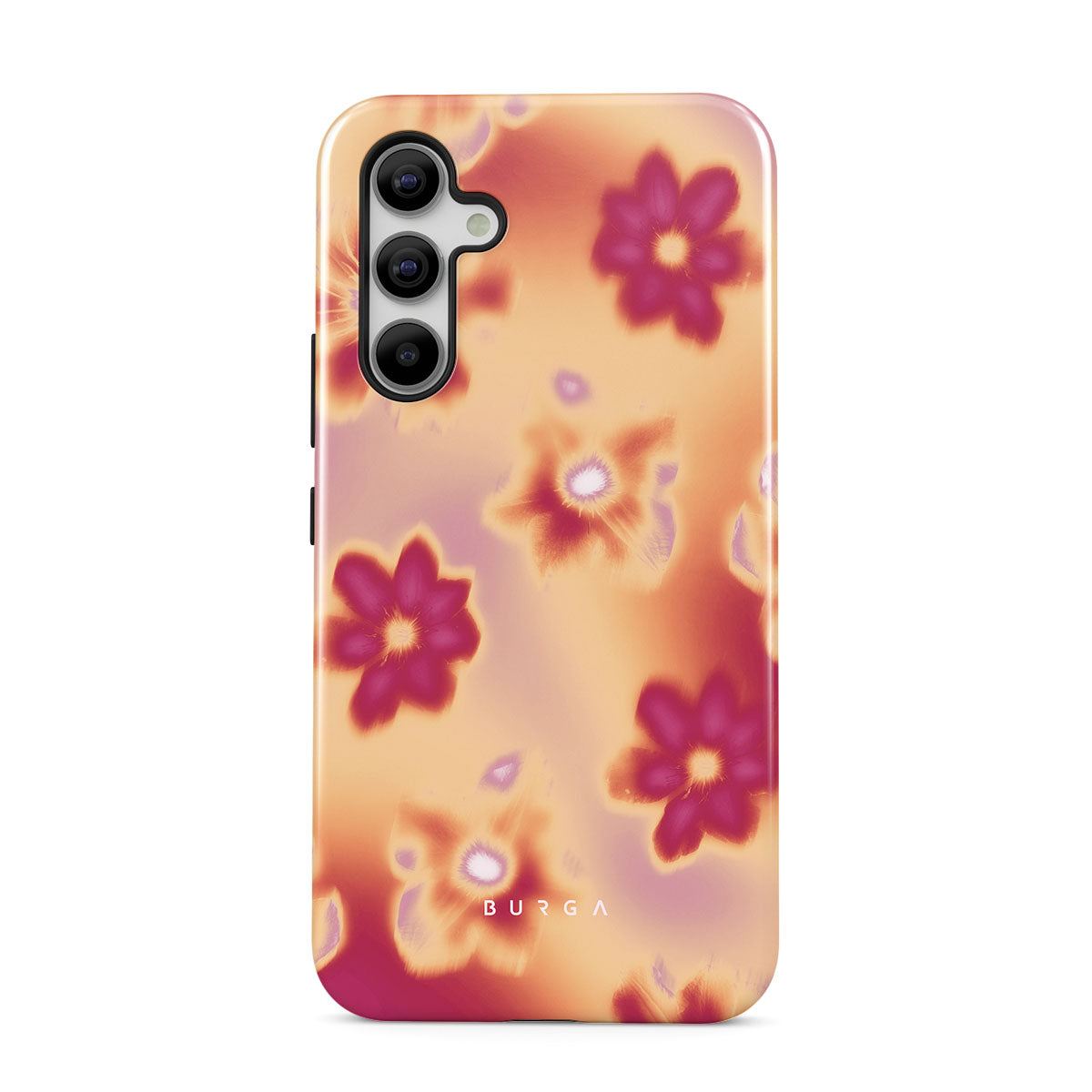 Get lost in the allure of our Divine Samsung Galaxy A55 phone case design. Picture blossoms bathed in fiery hues of pink and orange, each seemingly charged with life's raw energy. Set against a canvas that radiates power and warmth, these flowers offer more than just beauty; they resonate with the essence that binds us all.