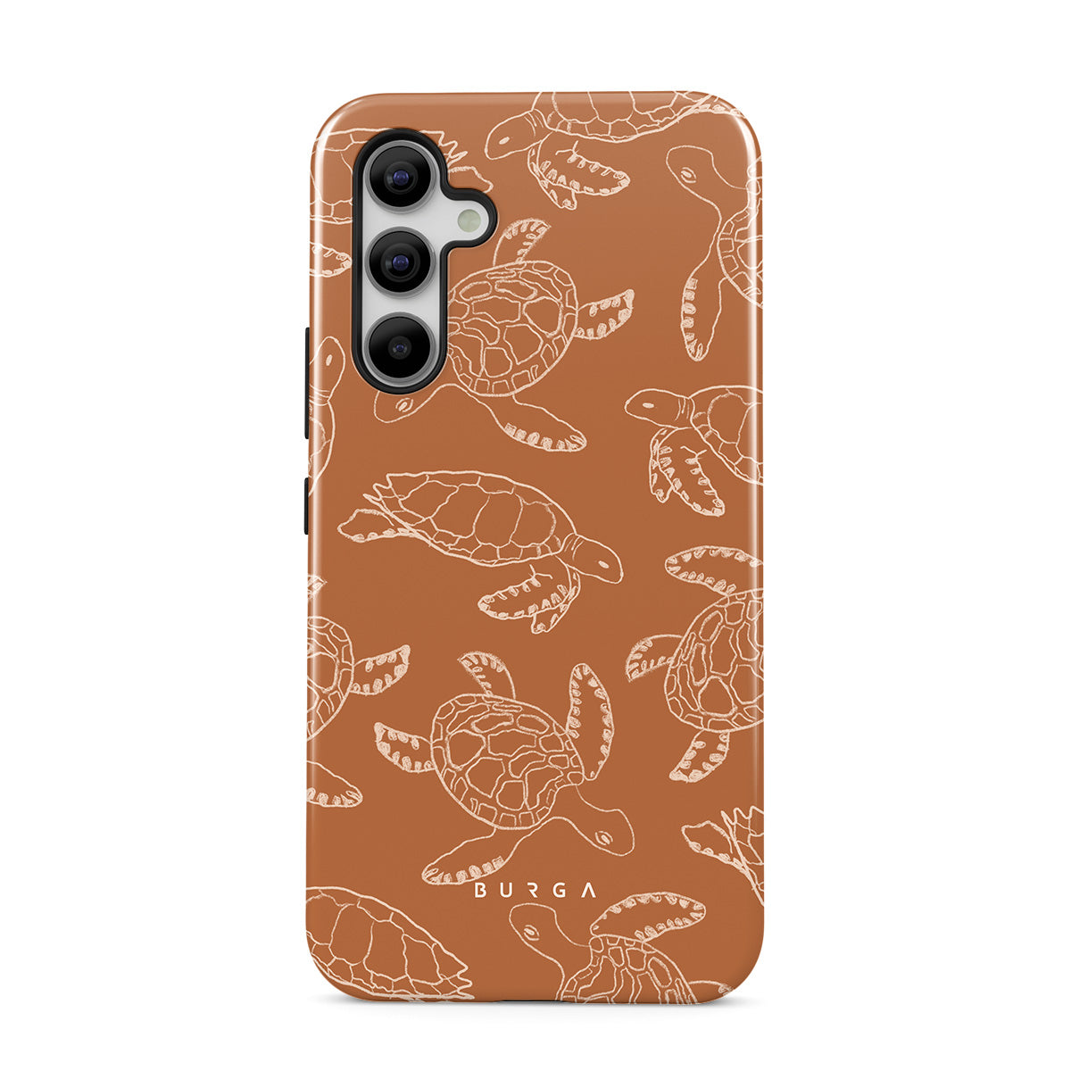 Step into a world of pure bliss and turtle magic with our Earth Shell design. The rich earth tones creating a calming ambiance blend beautifully with the playful turtles floating into adventure. Embark on a thrilling escapade to reconnect with nature with our Earth Shell Samsung Galaxy A54 case.