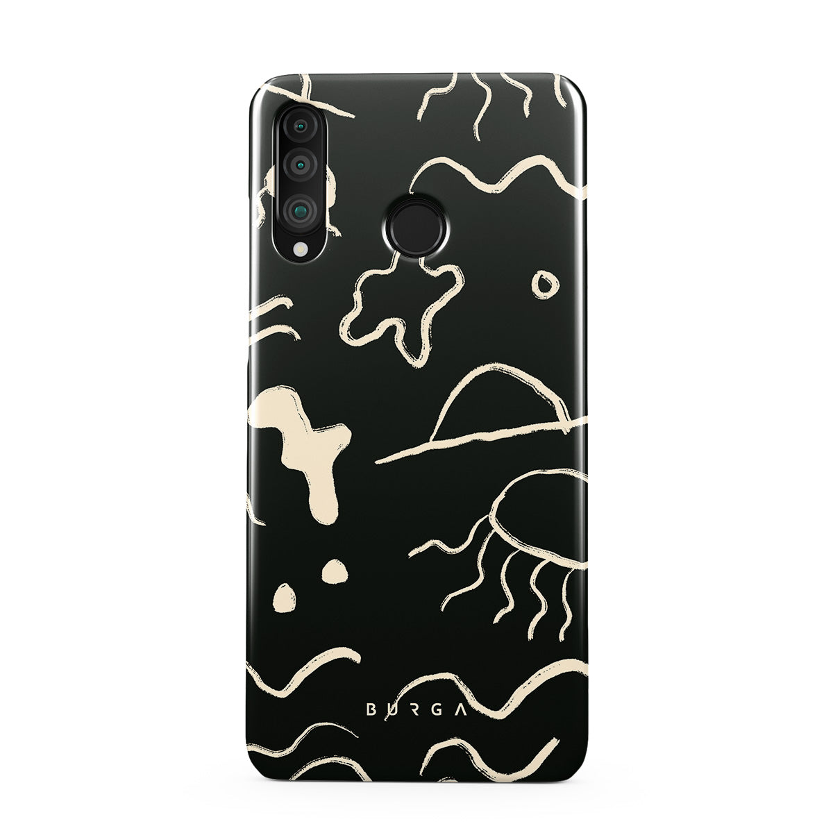 Our Eclipse Huawei P30 Lite design reflects the enigmatic beauty of the ocean during a solar eclipse. The dark hues and bright accents represent how the light dances on the water, while the waves and jellyfish capture the serene yet dynamic nature of the ocean.