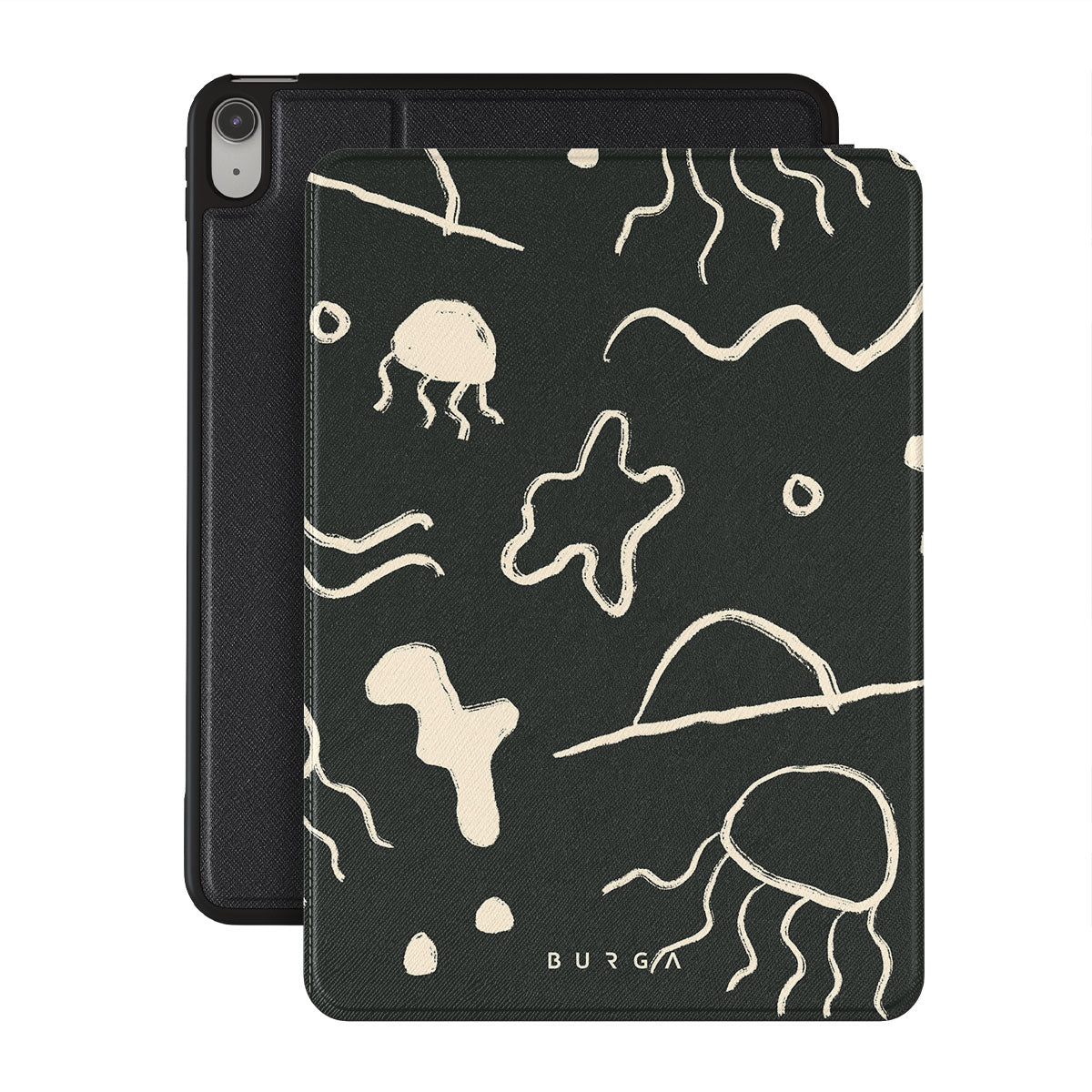 Our Eclipse iPad 10.9 (A16/10th Gen) folio case reflects the enigmatic beauty of the ocean during a solar eclipse. The dark hues and bright accents represent how the light dances on the water, while the waves and jellyfish capture the serene yet dynamic nature of the ocean.