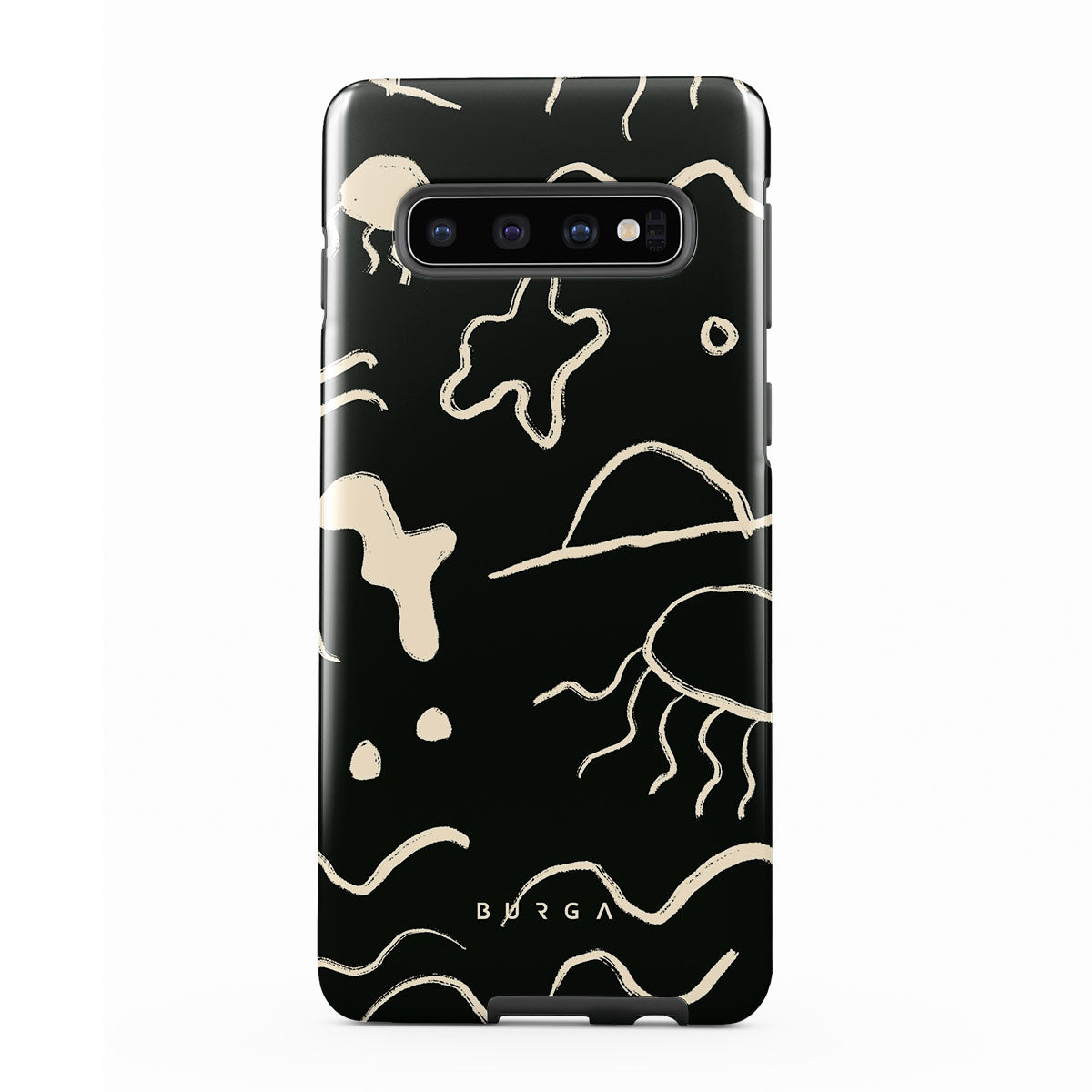 Our Eclipse Samsung Galaxy S10 4G design reflects the enigmatic beauty of the ocean during a solar eclipse. The dark hues and bright accents represent how the light dances on the water, while the waves and jellyfish capture the serene yet dynamic nature of the ocean.