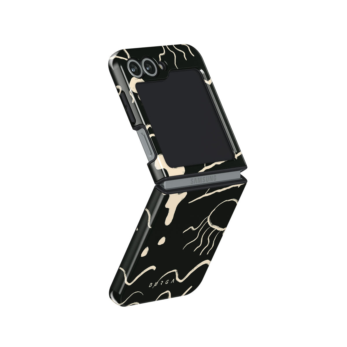 Our Eclipse Samsung Galaxy Z Flip 6 design reflects the enigmatic beauty of the ocean during a solar eclipse. The dark hues and bright accents represent how the light dances on the water, while the waves and jellyfish capture the serene yet dynamic nature of the ocean.
