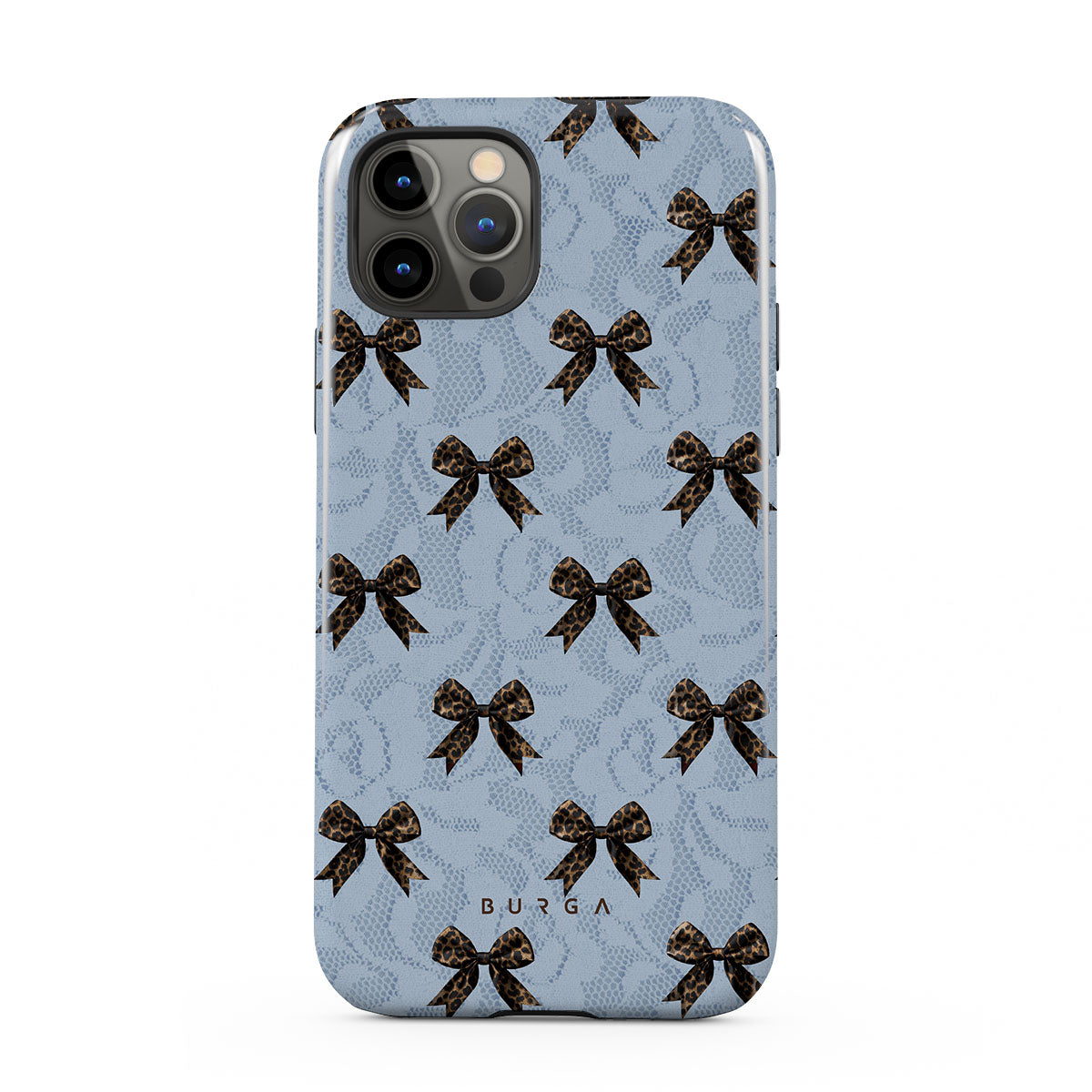 For those who command attention with subtle elegance, our Fashionista iPhone 12 Pro phone case design is your go-to. A soft blue background, accented by dark grey bows and subtle lace patterns, exudes polished, effortless style. It's quiet confidence with a hint of charm.