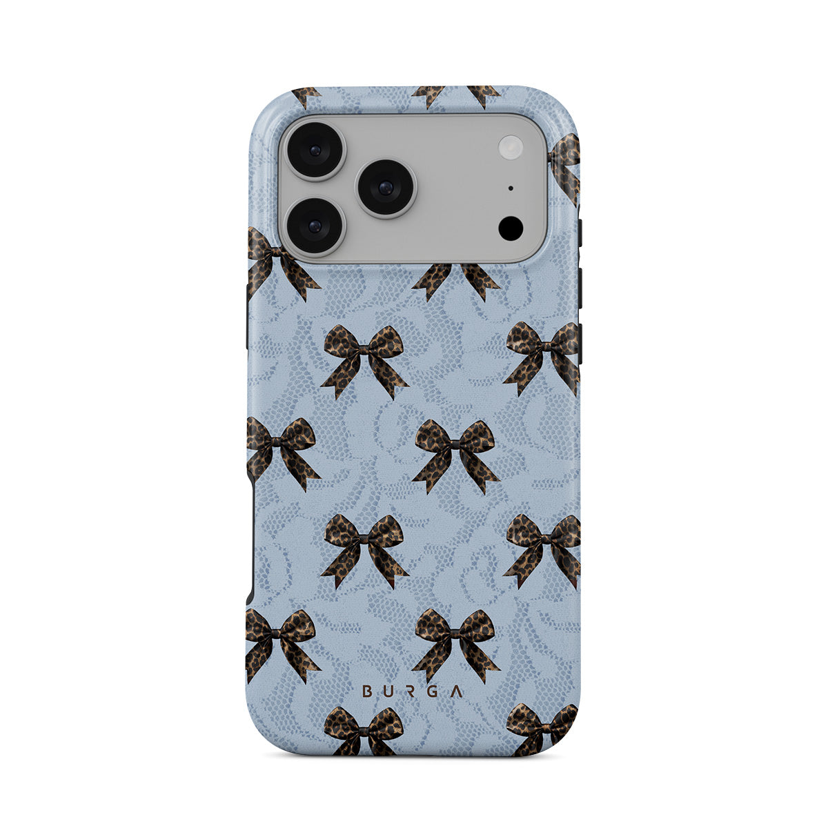For those who command attention with subtle elegance, our Fashionista iPhone 17 Pro Max phone case design is your go-to. A soft blue background, accented by dark grey bows and subtle lace patterns, exudes polished, effortless style. It's quiet confidence with a hint of charm.