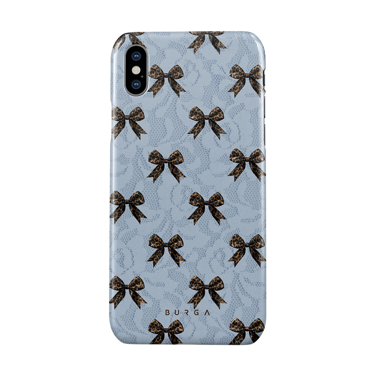 For those who command attention with subtle elegance, our Fashionista iPhone X / XS phone case design is your go-to. A soft blue background, accented by dark grey bows and subtle lace patterns, exudes polished, effortless style. It's quiet confidence with a hint of charm.