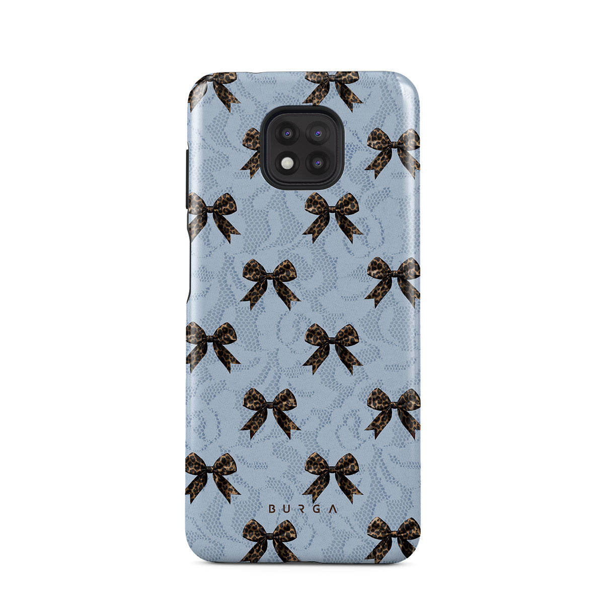 For those who command attention with subtle elegance, our Fashionista Motorola Moto G Power 2021 phone case design is your go-to. A soft blue background, accented by dark grey bows and subtle lace patterns, exudes polished, effortless style. It's quiet confidence with a hint of charm.