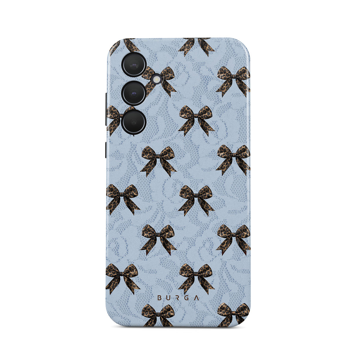For those who command attention with subtle elegance, our Fashionista Samsung Galaxy A35 phone case design is your go-to. A soft blue background, accented by dark grey bows and subtle lace patterns, exudes polished, effortless style. It's quiet confidence with a hint of charm.