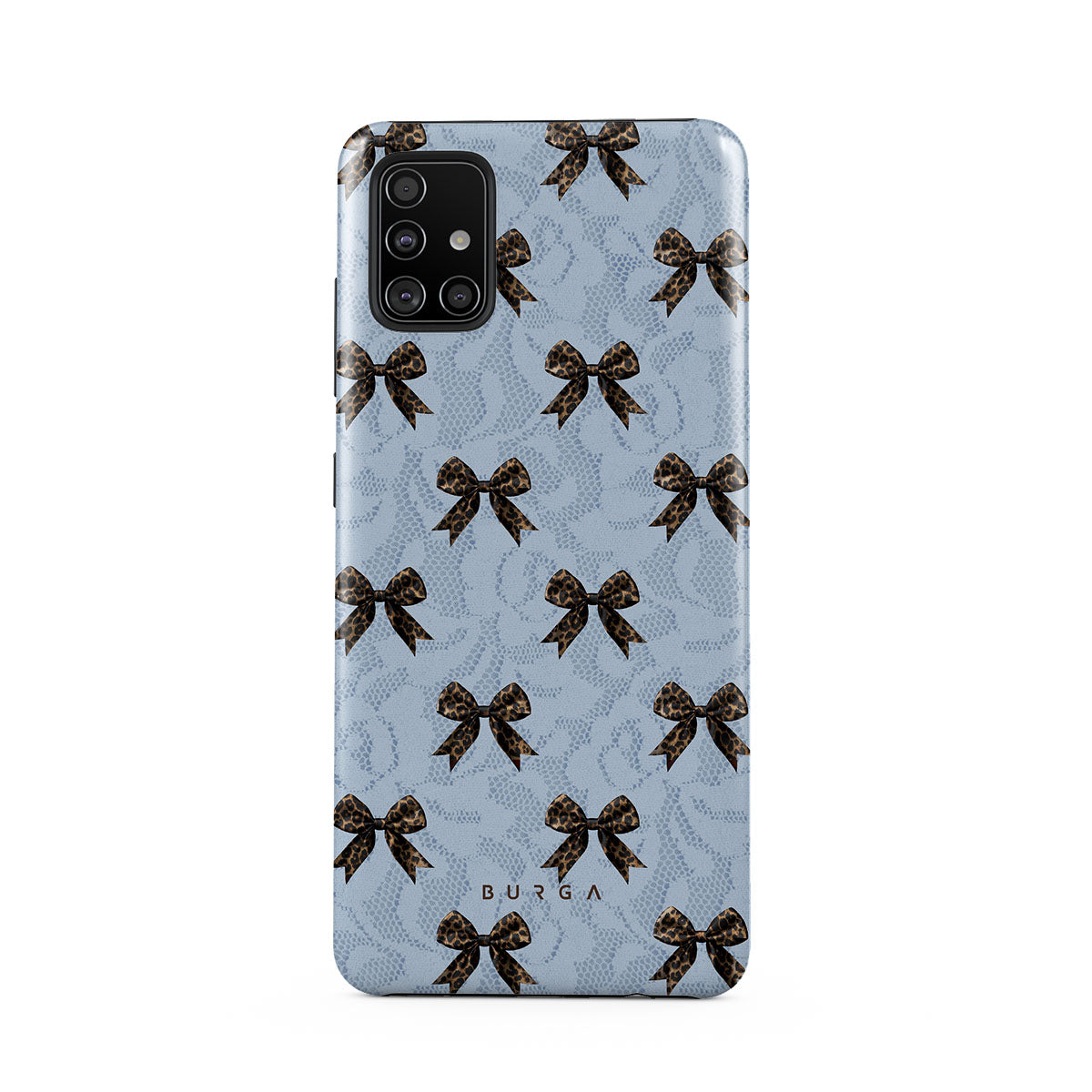 For those who command attention with subtle elegance, our Fashionista Samsung Galaxy A71 4G phone case design is your go-to. A soft blue background, accented by dark grey bows and subtle lace patterns, exudes polished, effortless style. It's quiet confidence with a hint of charm.