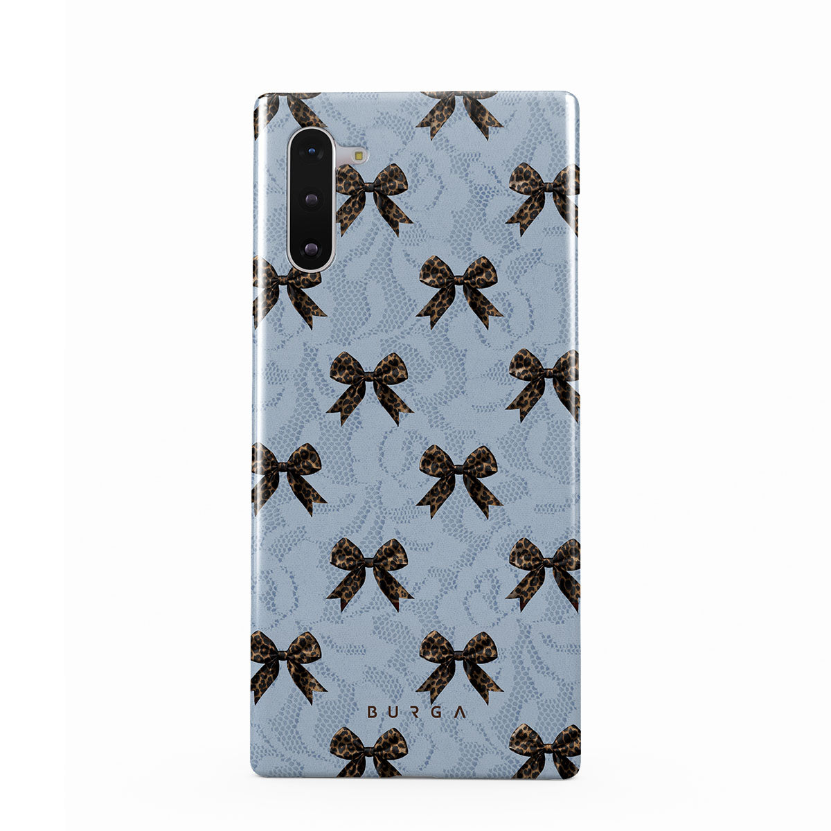 For those who command attention with subtle elegance, our Fashionista Samsung Galaxy Note 10 phone case design is your go-to. A soft blue background, accented by dark grey bows and subtle lace patterns, exudes polished, effortless style. It's quiet confidence with a hint of charm.