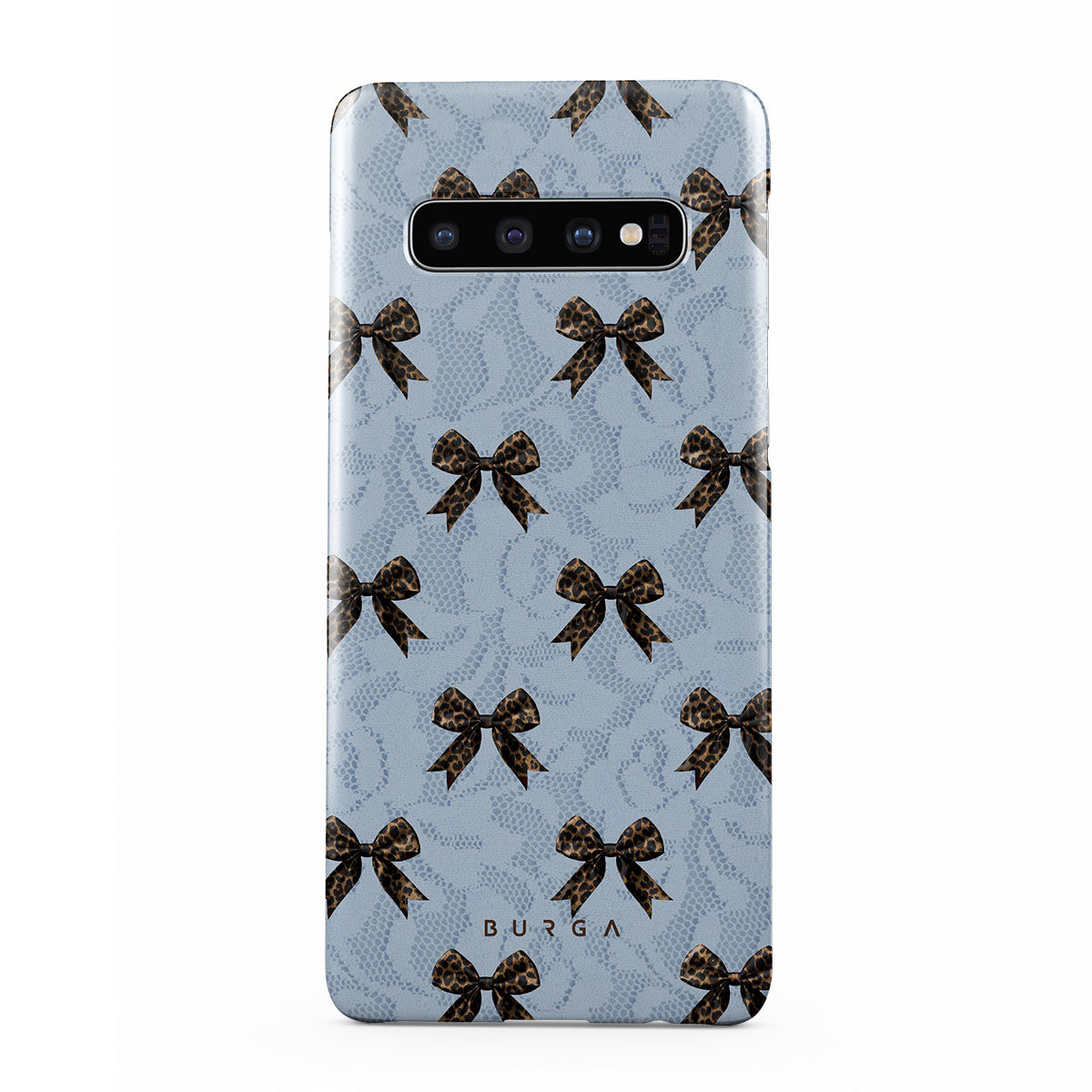 For those who command attention with subtle elegance, our Fashionista Samsung Galaxy S10 Plus phone case design is your go-to. A soft blue background, accented by dark grey bows and subtle lace patterns, exudes polished, effortless style. It's quiet confidence with a hint of charm.