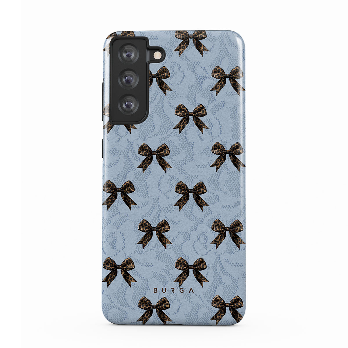 For those who command attention with subtle elegance, our Fashionista Samsung Galaxy S21 FE phone case design is your go-to. A soft blue background, accented by dark grey bows and subtle lace patterns, exudes polished, effortless style. It's quiet confidence with a hint of charm.