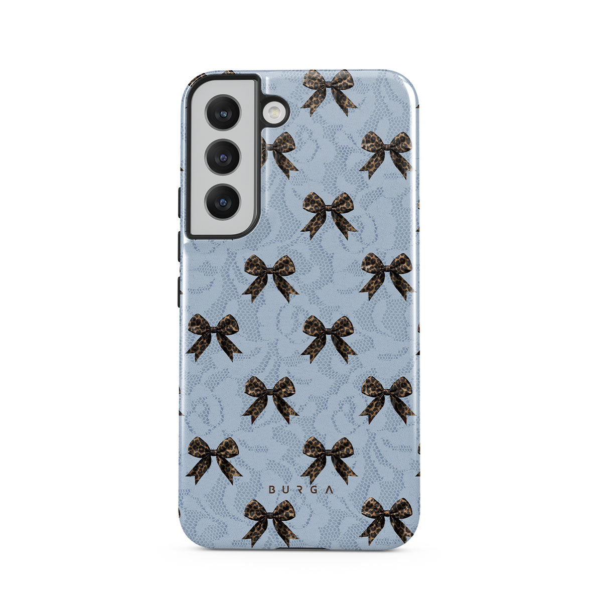 For those who command attention with subtle elegance, our Fashionista Samsung Galaxy S22 Plus phone case design is your go-to. A soft blue background, accented by dark grey bows and subtle lace patterns, exudes polished, effortless style. It's quiet confidence with a hint of charm.