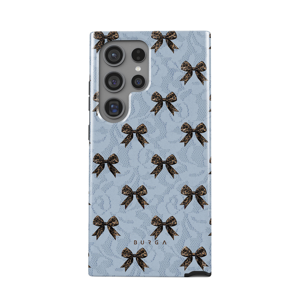 For those who command attention with subtle elegance, our Fashionista Samsung Galaxy S24 Ultra phone case design is your go-to. A soft blue background, accented by dark grey bows and subtle lace patterns, exudes polished, effortless style. It's quiet confidence with a hint of charm.