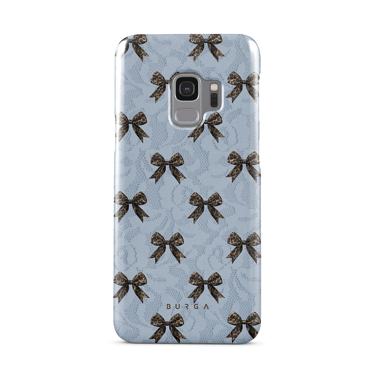 For those who command attention with subtle elegance, our Fashionista Samsung Galaxy S9 phone case design is your go-to. A soft blue background, accented by dark grey bows and subtle lace patterns, exudes polished, effortless style. It's quiet confidence with a hint of charm.