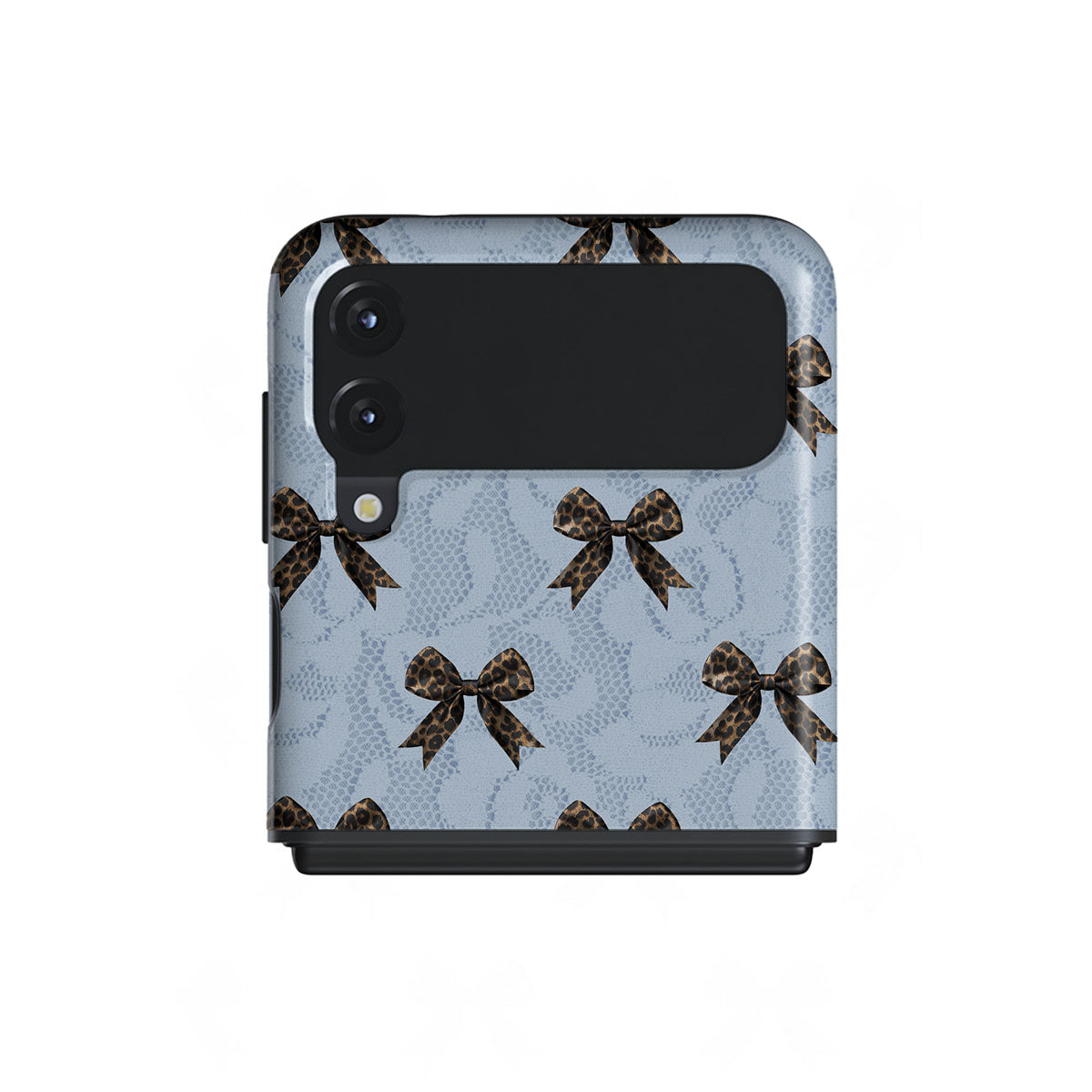 For those who command attention with subtle elegance, our Fashionista Samsung Galaxy Z Flip 3 phone case design is your go-to. A soft blue background, accented by dark grey bows and subtle lace patterns, exudes polished, effortless style. It's quiet confidence with a hint of charm.