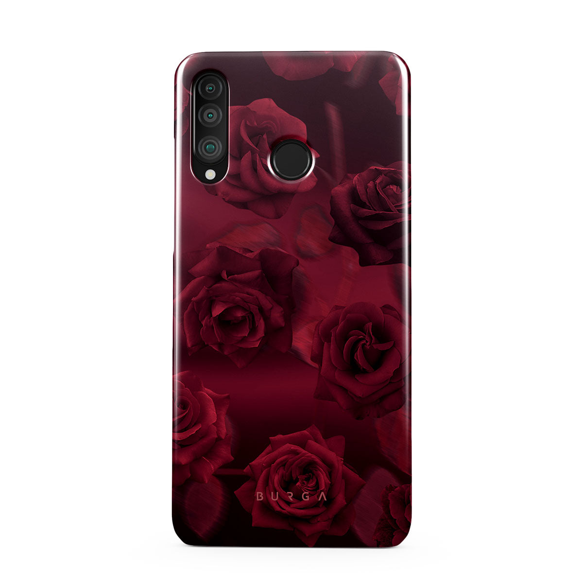 Dive into our intriguing Femme Fatale Huawei P30 Lite phone case design. These deep red roses aren't just flowers—they're silent confessions of candlelit romance and moments caught in stolen glances. Crafted for those who captivate at every turn.
