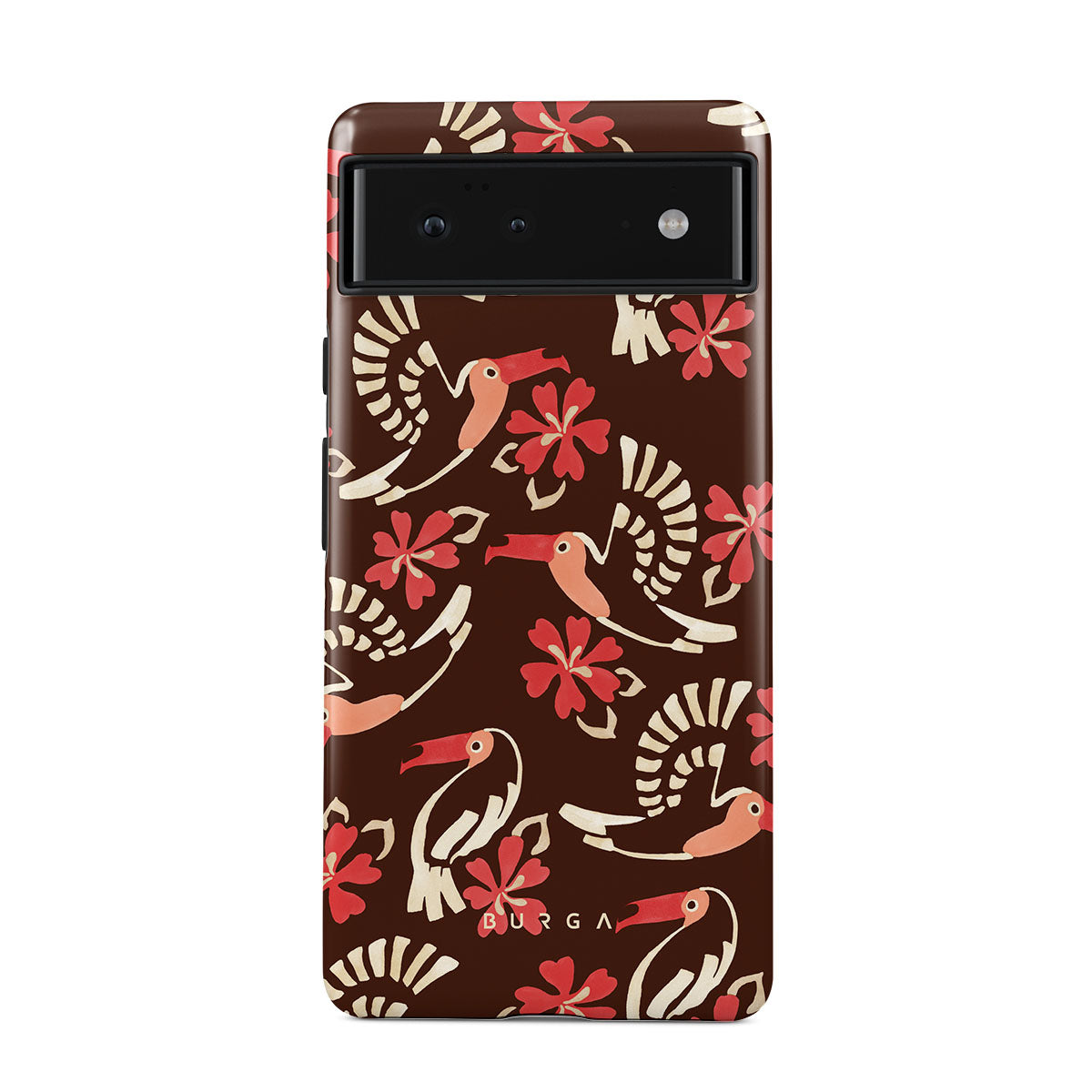 A jungle rave. Parrots, florals, bursts of red and cream—like someone threw a party in the rainforest and forgot to send you the invite. This Google Pixel 6a phone case design is your RSVP.