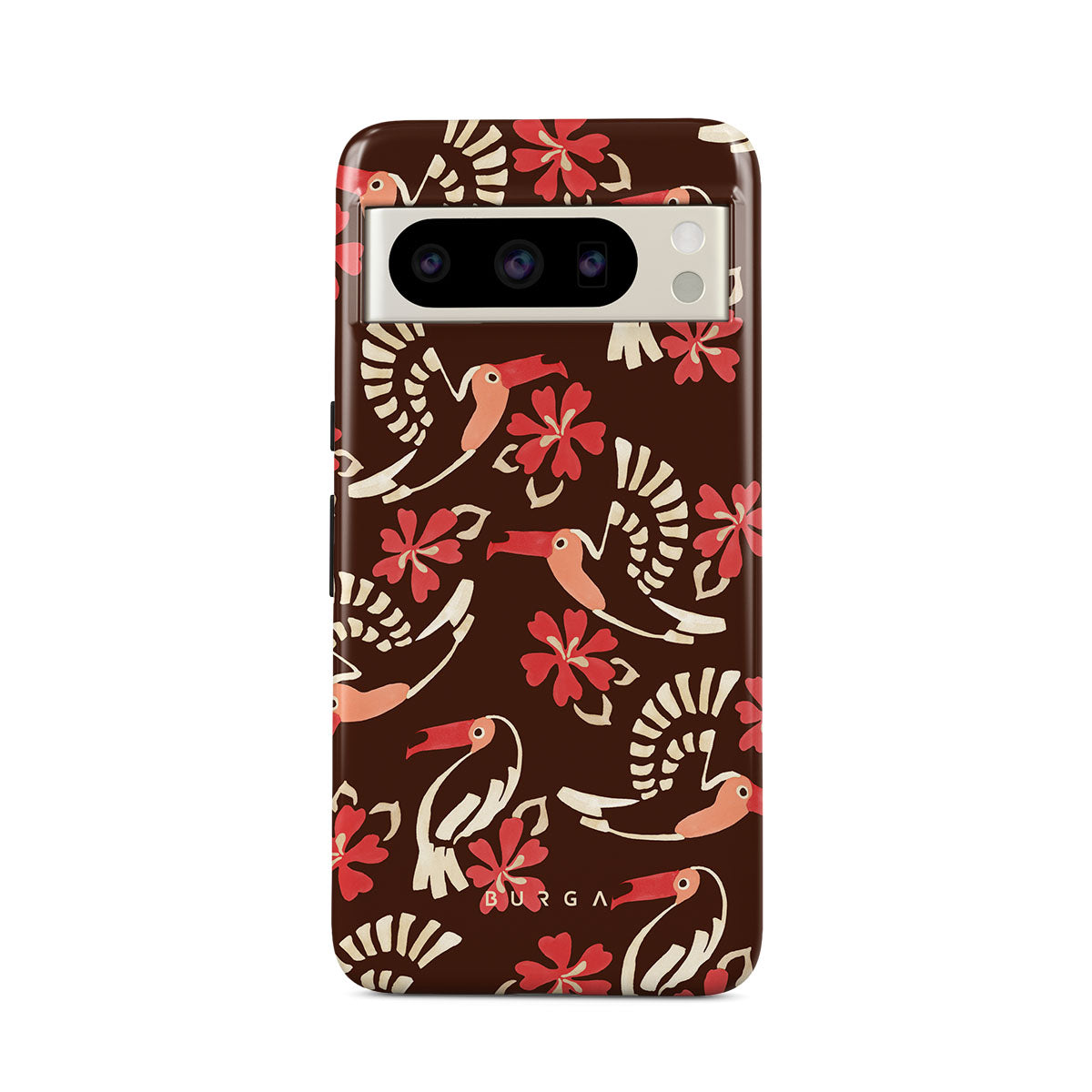 A jungle rave. Parrots, florals, bursts of red and cream—like someone threw a party in the rainforest and forgot to send you the invite. This Google Pixel 8 Pro phone case design is your RSVP.