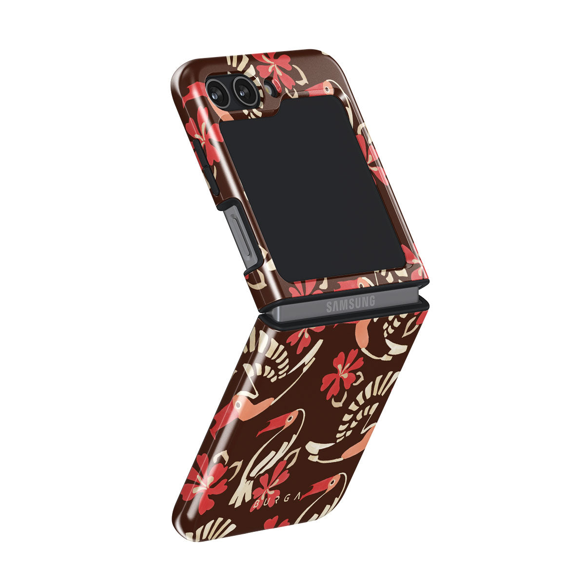 A jungle rave. Parrots, florals, bursts of red and cream—like someone threw a party in the rainforest and forgot to send you the invite. This Samsung Galaxy Z Flip 5 phone case design is your RSVP.