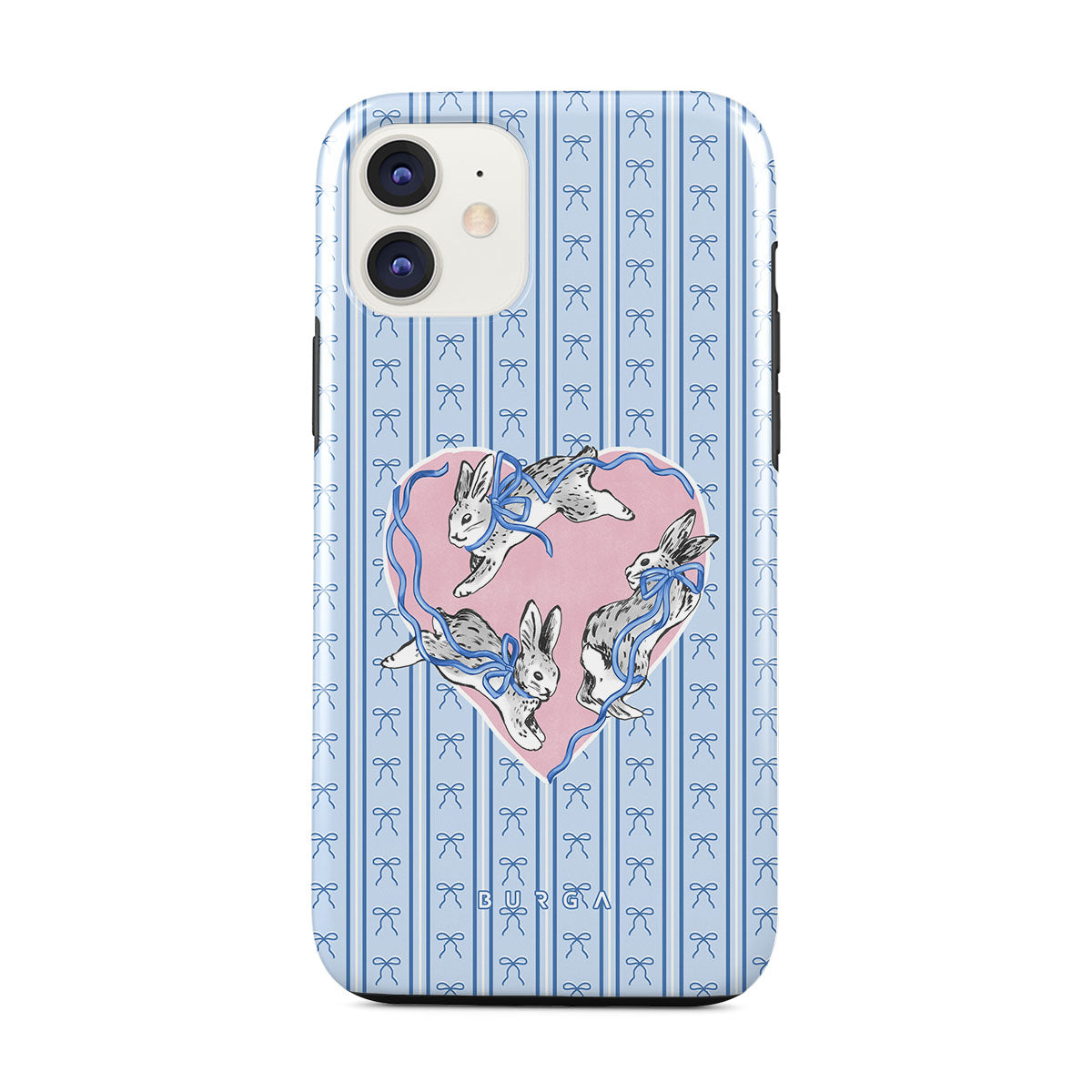 This design features: white rabbits, heart frame, blue stripes