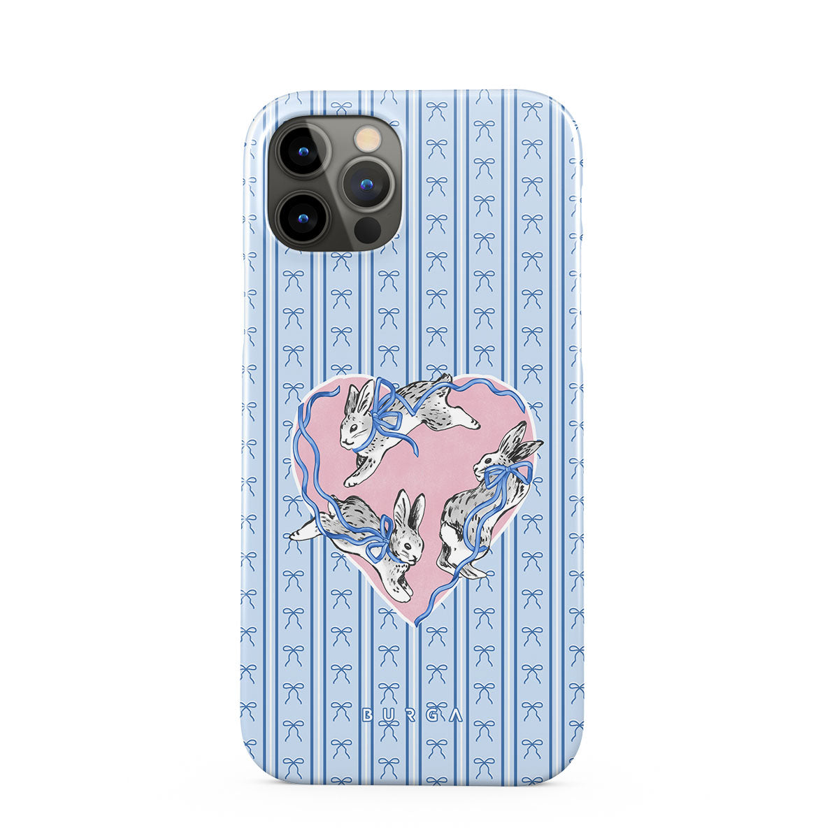 This design features: white rabbits, heart frame, blue stripes