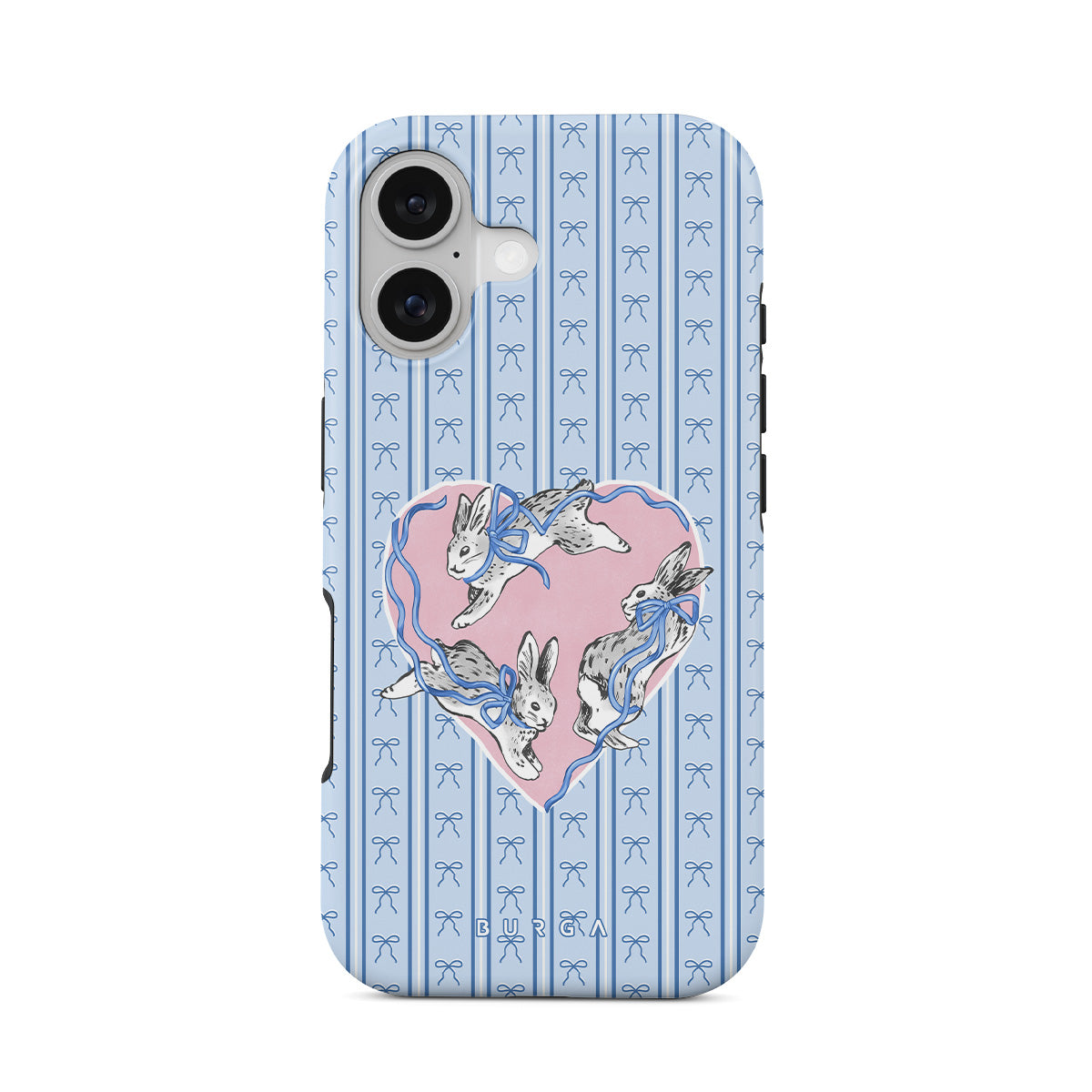 This design features: white rabbits, heart frame, blue stripes
