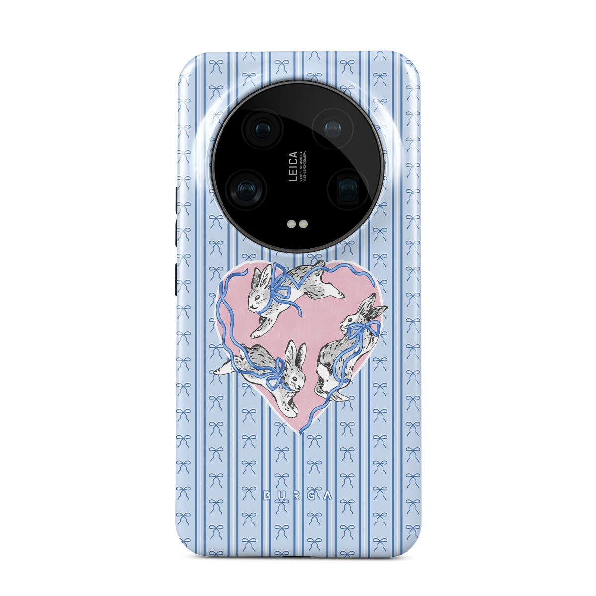 This design features: white rabbits, heart frame, blue stripes