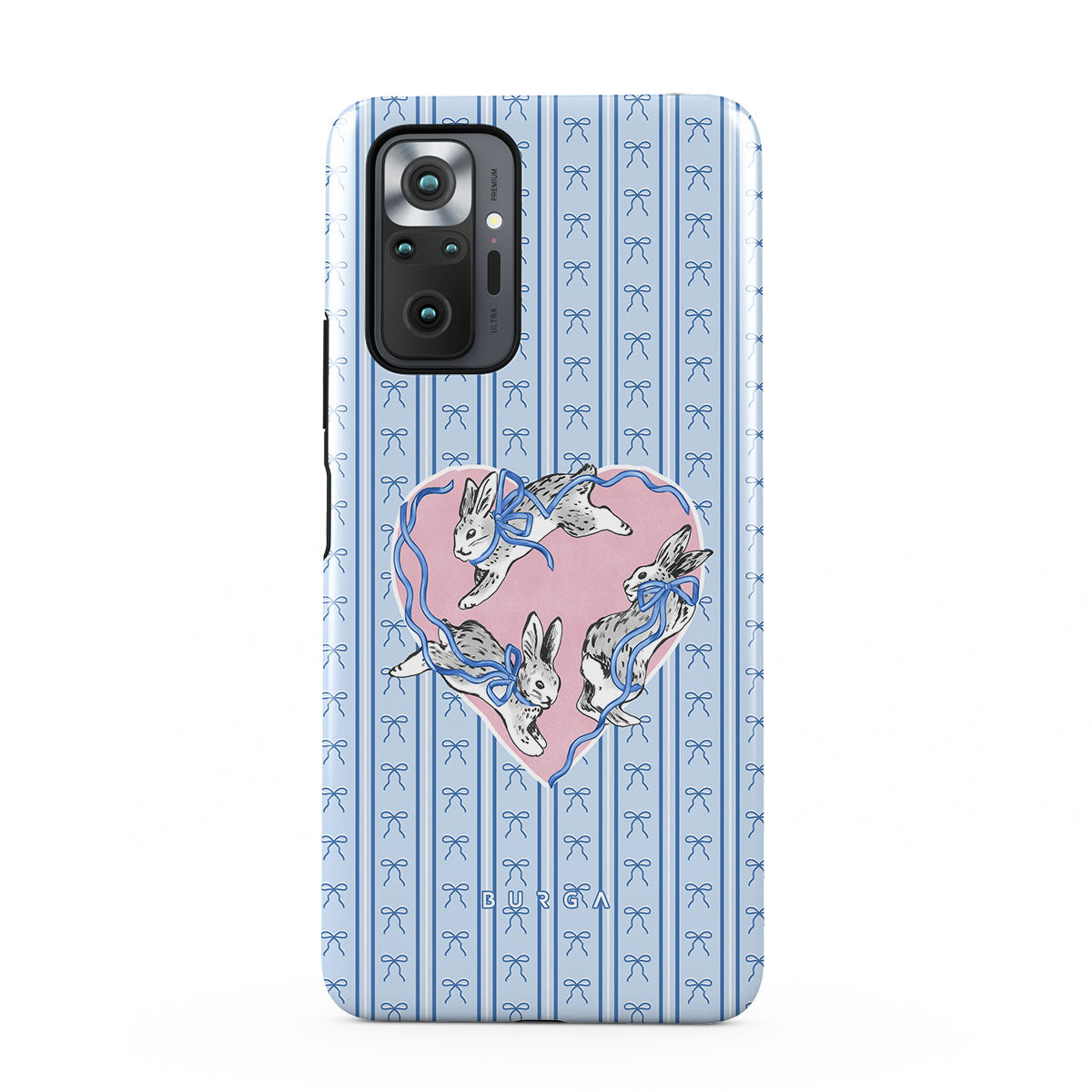 This design features: white rabbits, heart frame, blue stripes