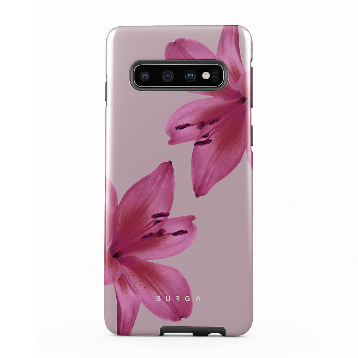 A gentle hush of pink forms where soft lilies sway. Their tender petals — a silent ode to the delicate dance of life. The Fragile Beauty Samsung Galaxy S10 4G phone case design invites you to lean into the soft embrace of nature, letting its subtle rhythms guide your journey.
