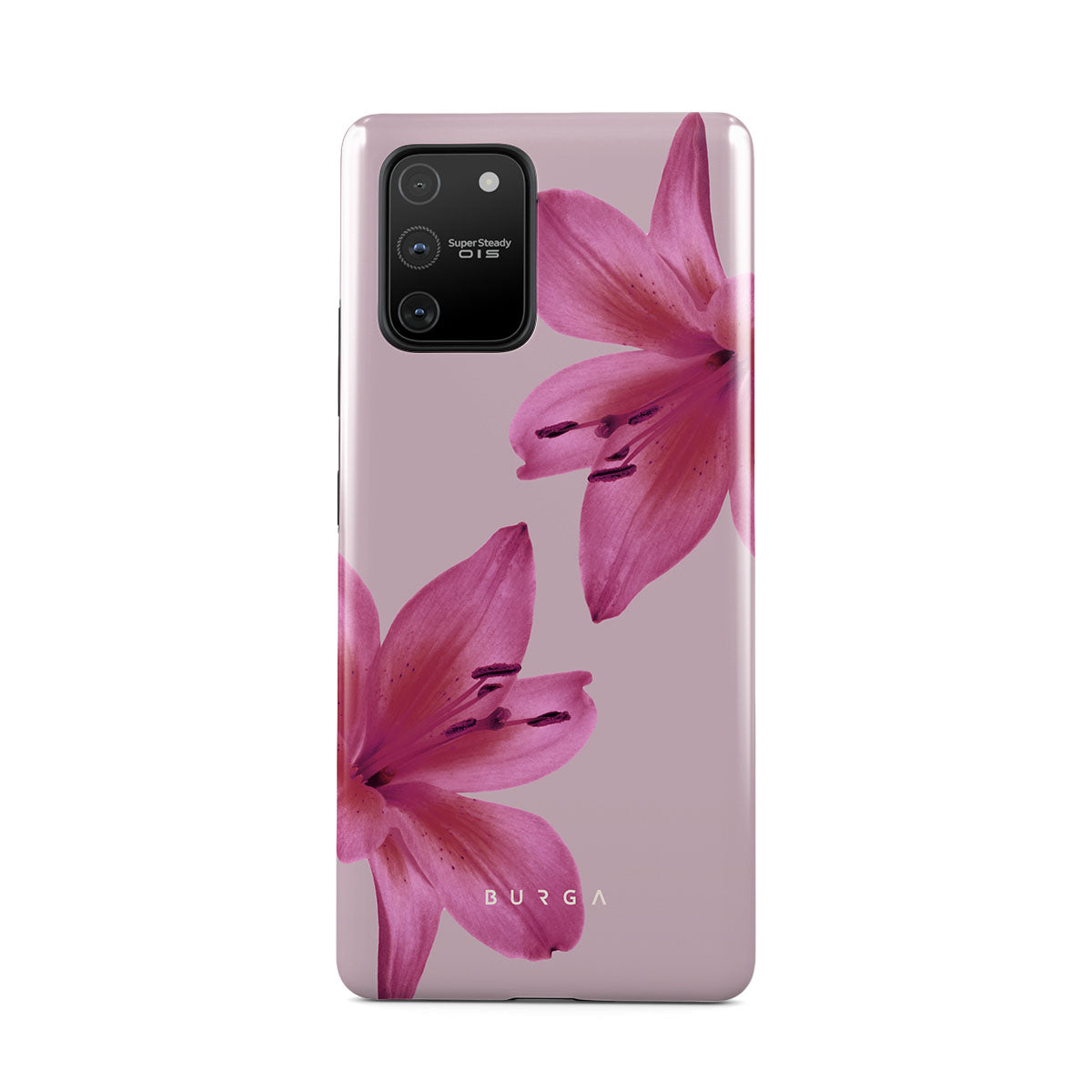 A gentle hush of pink forms where soft lilies sway. Their tender petals — a silent ode to the delicate dance of life. The Fragile Beauty Samsung Galaxy S10 Lite phone case design invites you to lean into the soft embrace of nature, letting its subtle rhythms guide your journey.