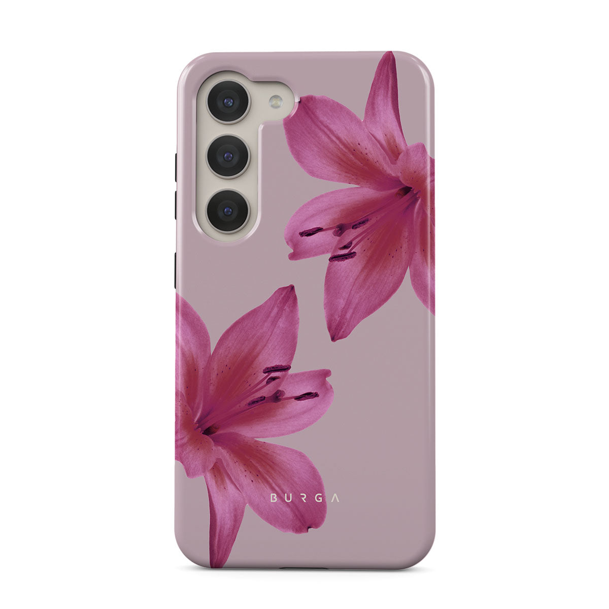 A gentle hush of pink forms where soft lilies sway. Their tender petals — a silent ode to the delicate dance of life. The Fragile Beauty Samsung Galaxy S23 phone case design invites you to lean into the soft embrace of nature, letting its subtle rhythms guide your journey.