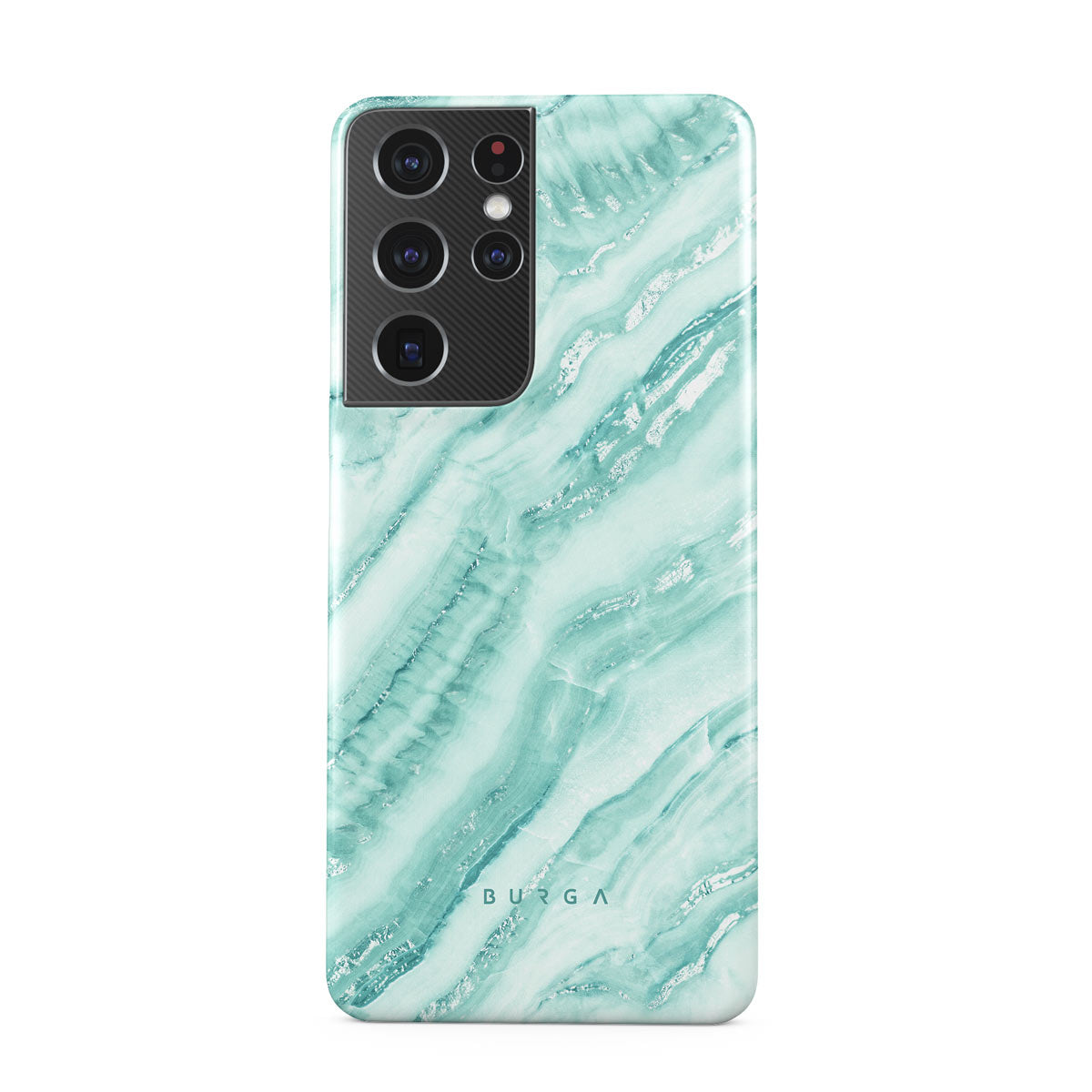 Add freshness to your style with our Fresh Breeze Samsung Galaxy S21 Ultra phone case. The soft cyan color of the case is emphasized in a unique marble pattern. Do not let the softness of the color deceive you; the case still offers heavy-duty protection for your cellphone.