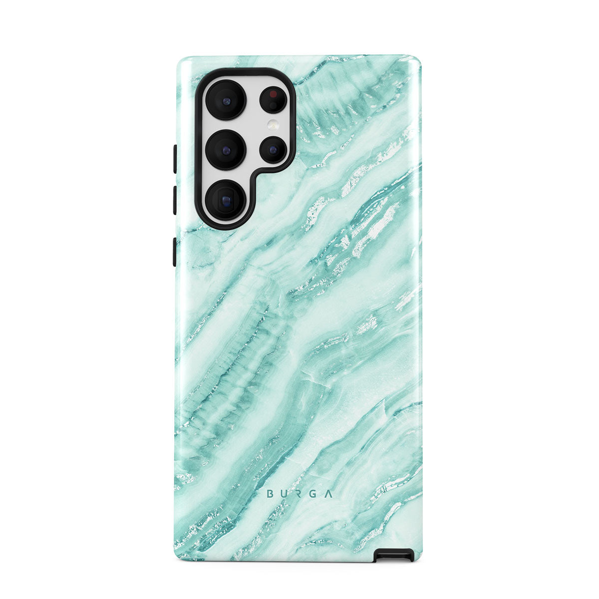 Add freshness to your style with our Fresh Breeze Samsung Galaxy S22 Ultra phone case. The soft cyan color of the case is emphasized in a unique marble pattern. Do not let the softness of the color deceive you; the case still offers heavy-duty protection for your cellphone.