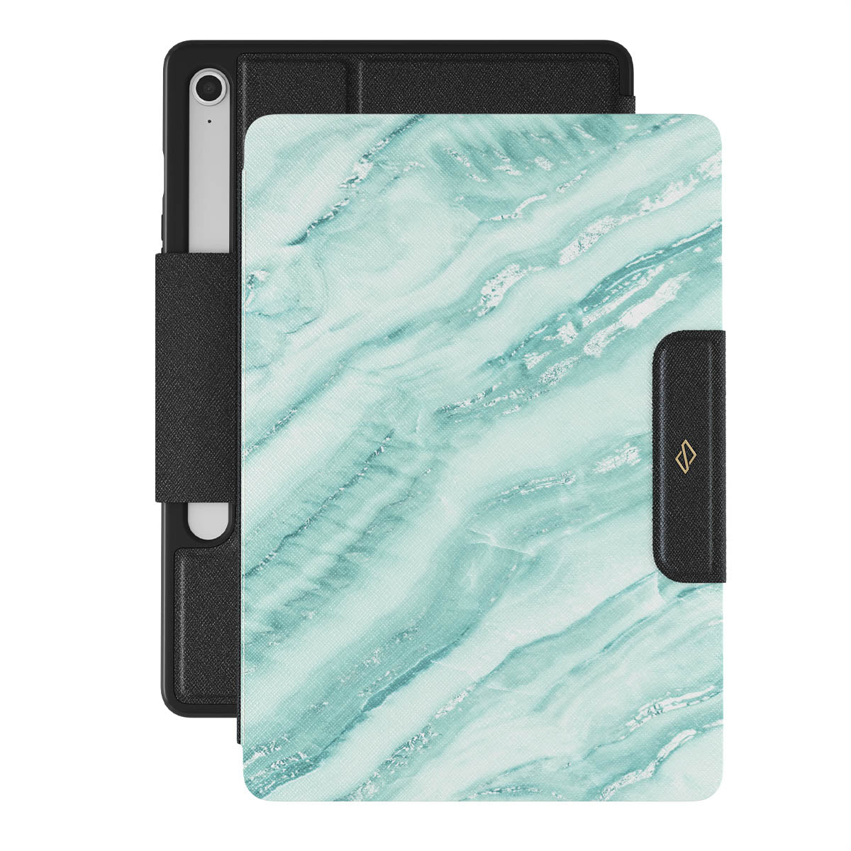 Add freshness to your style with our Fresh Breeze Samsung Galaxy Tab S10 FE folio case. The soft cyan color of the case is emphasized in a unique marble pattern. Do not let the softness of the color deceive you; the case still offers heavy-duty protection for your cellGalaxy Tab.