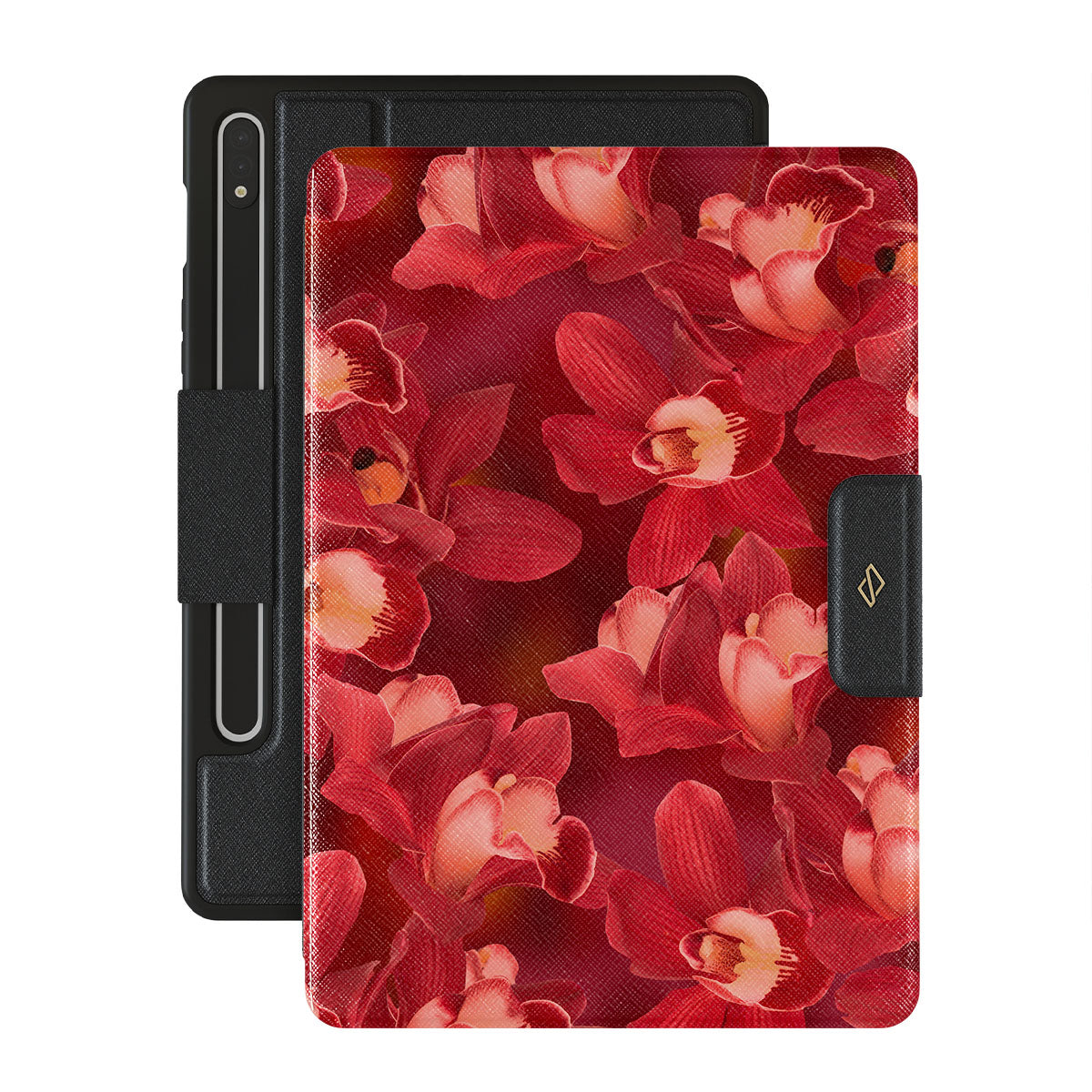 The deep red orchids emerge with a passionate intensity, evoking the fervor and depth of emotions that come with fully experiencing life. They are a vibrant call to embrace every heartbeat, to live deeply and love boldly. Discover the Goddess Energy Samsung Galaxy Tab S8/S7 folio case design.