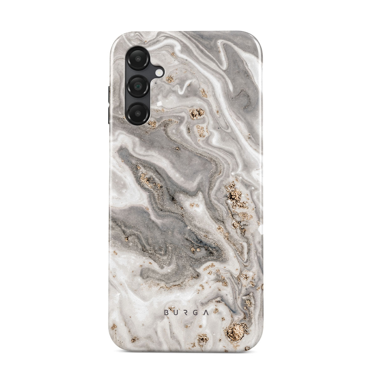The wind outside is playing his songs. Some fear, some love, and some simply enjoy. But do not be afraid, with our grey marble Samsung Galaxy A25 phone case inspired by a beautiful snowstorm, you can have the pretty part of it without any coldness. And as the case offers heavy-duty protection, your phone will also be safe and sound!