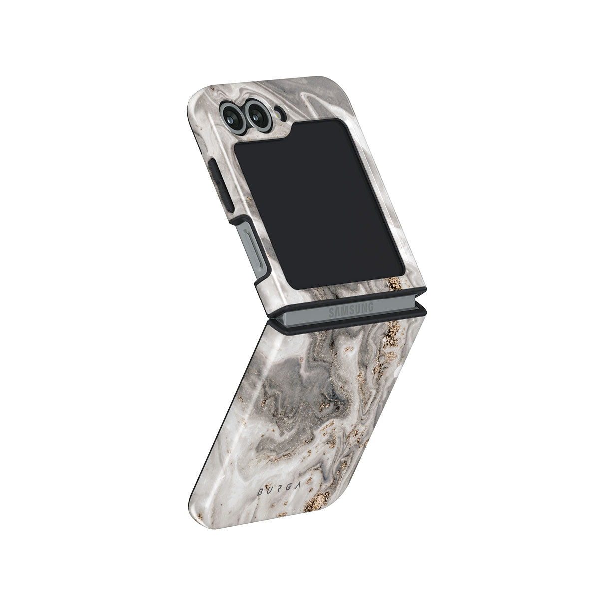 The wind outside is playing his songs. Some fear, some love, and some simply enjoy. But do not be afraid, with our grey marble Samsung Galaxy Z Flip 6 phone case inspired by a beautiful snowstorm, you can have the pretty part of it without any coldness. And as the case offers heavy-duty protection, your phone will also be safe and sound!