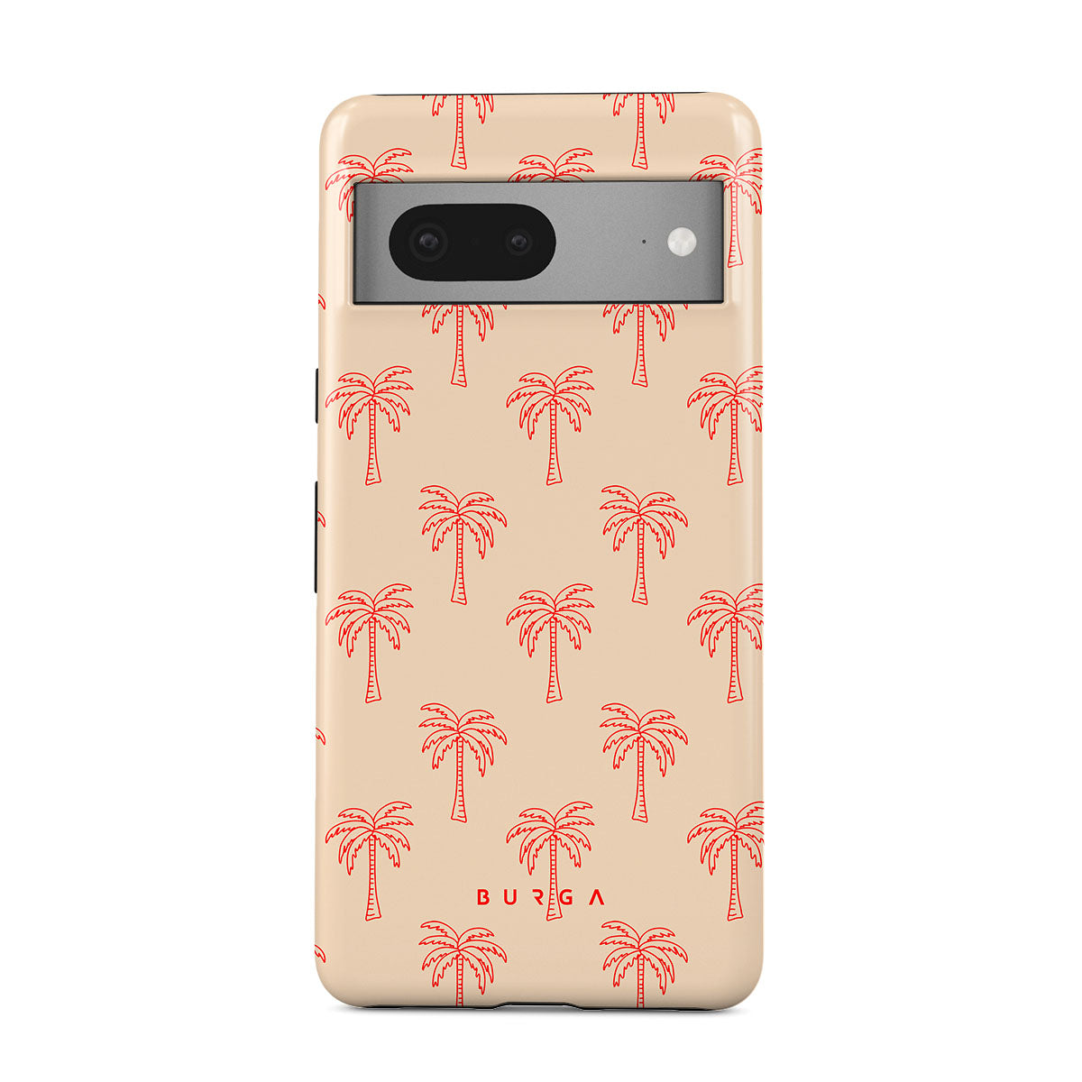 Retreat into the serene whispers of our Happy Hour design. Gentle pink palms sway on a soothing blush background, creating images of a tranquil paradise. This Google Pixel 7 phone case is perfect for dreamers and nature lovers who seek a daily escape into tranquility.
