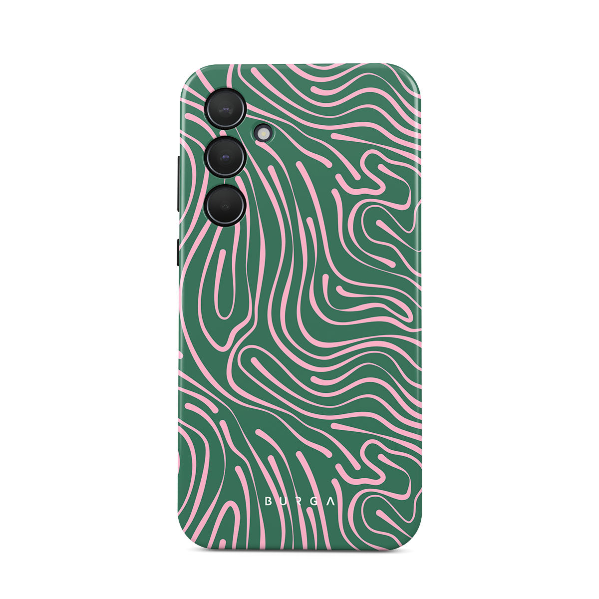 Fresh and mesmerizing, our Hawaiian Breeze Samsung Galaxy A35 phone case design combines a pastel pink wavy pattern with a crisp green background creating a refreshing look. The abstract pattern will indeed become a star in your accessorizing game, while the phone case will keep your device protected at all times!