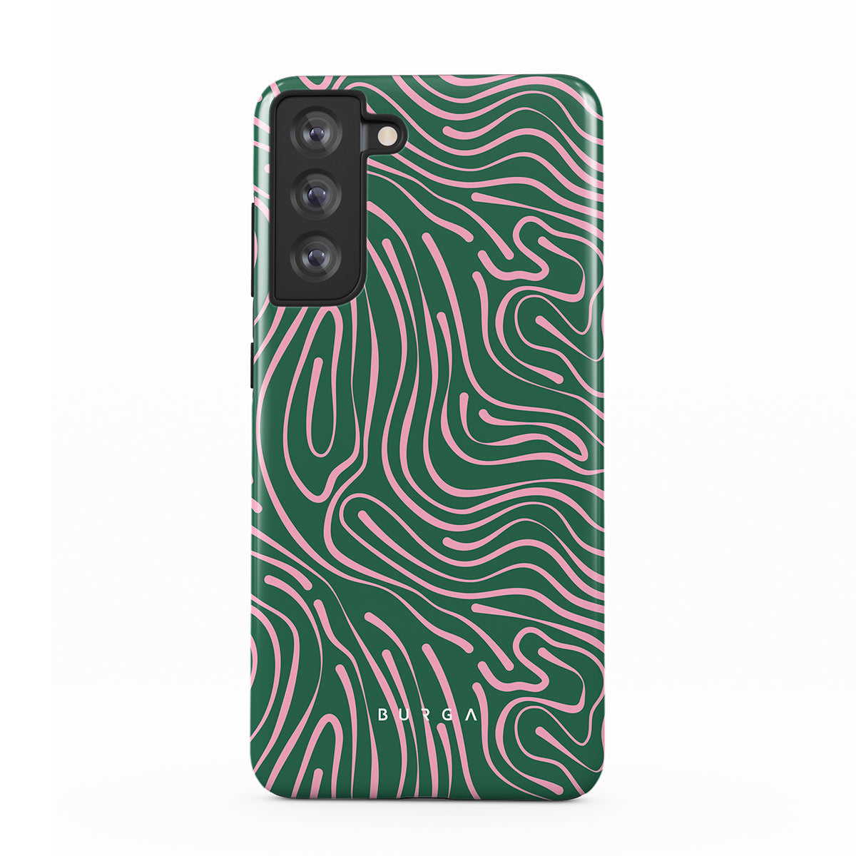 Fresh and mesmerizing, our Hawaiian Breeze Samsung Galaxy S21 FE phone case design combines a pastel pink wavy pattern with a crisp green background creating a refreshing look. The abstract pattern will indeed become a star in your accessorizing game, while the phone case will keep your device protected at all times!