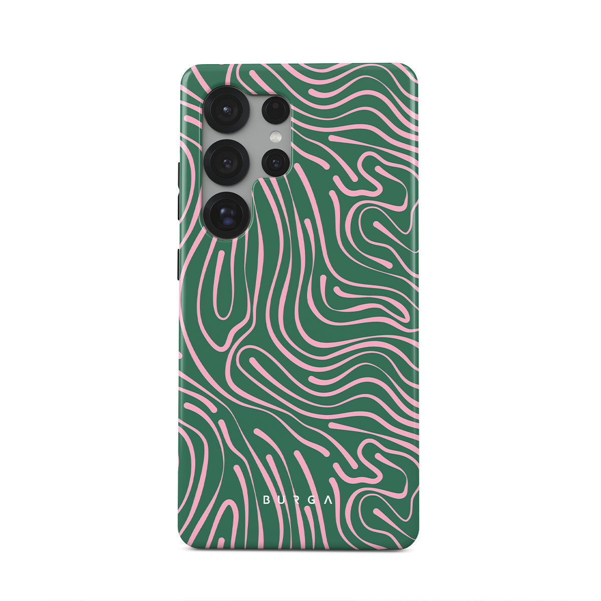 Fresh and mesmerizing, our Hawaiian Breeze Samsung Galaxy S25 Ultra phone case design combines a pastel pink wavy pattern with a crisp green background creating a refreshing look. The abstract pattern will indeed become a star in your accessorizing game, while the phone case will keep your device protected at all times!