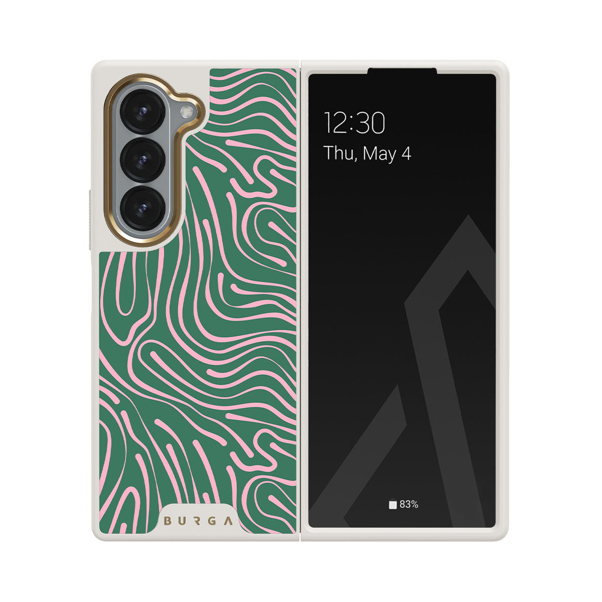 Fresh and mesmerizing, our Hawaiian Breeze Samsung Galaxy Z Fold 6 phone case design combines a pastel pink wavy pattern with a crisp green background creating a refreshing look. The abstract pattern will indeed become a star in your accessorizing game, while the phone case will keep your device protected at all times!