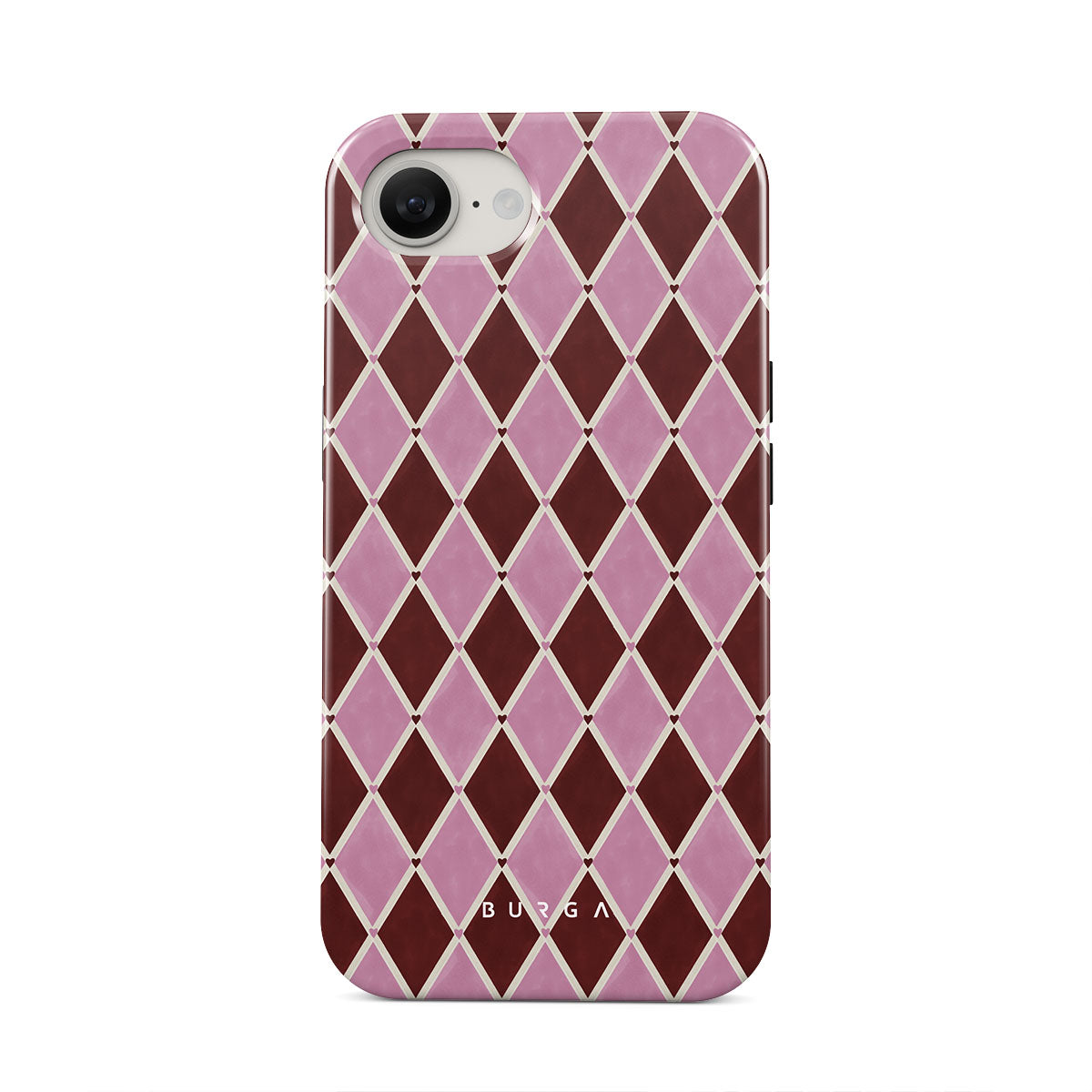 This design features: harlequin pattern, pink diamonds, deep red background