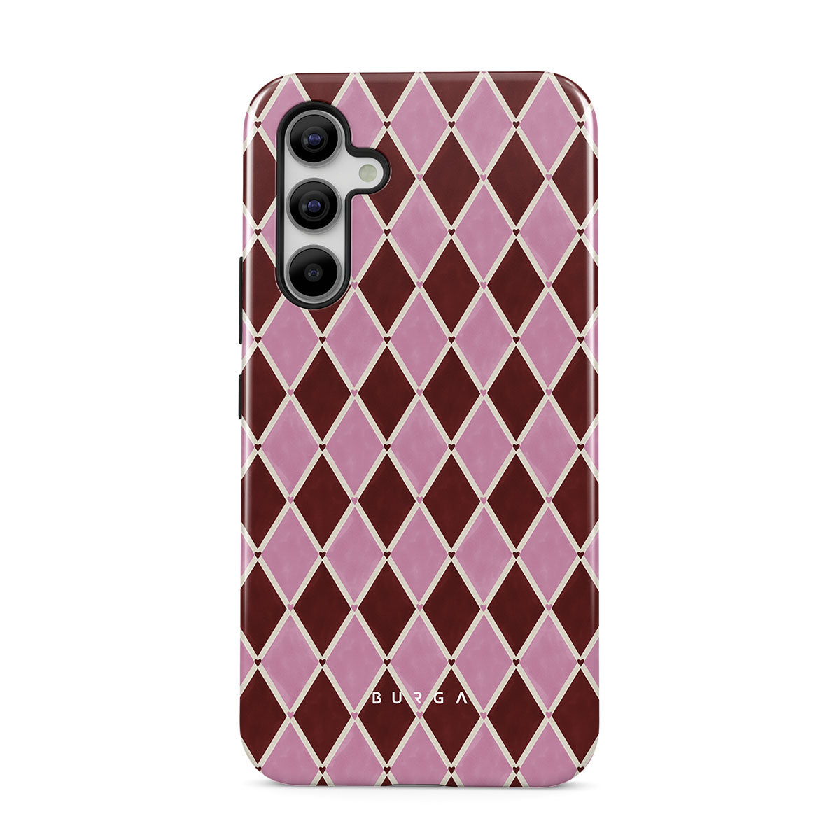 This design features: harlequin pattern, pink diamonds, deep red background