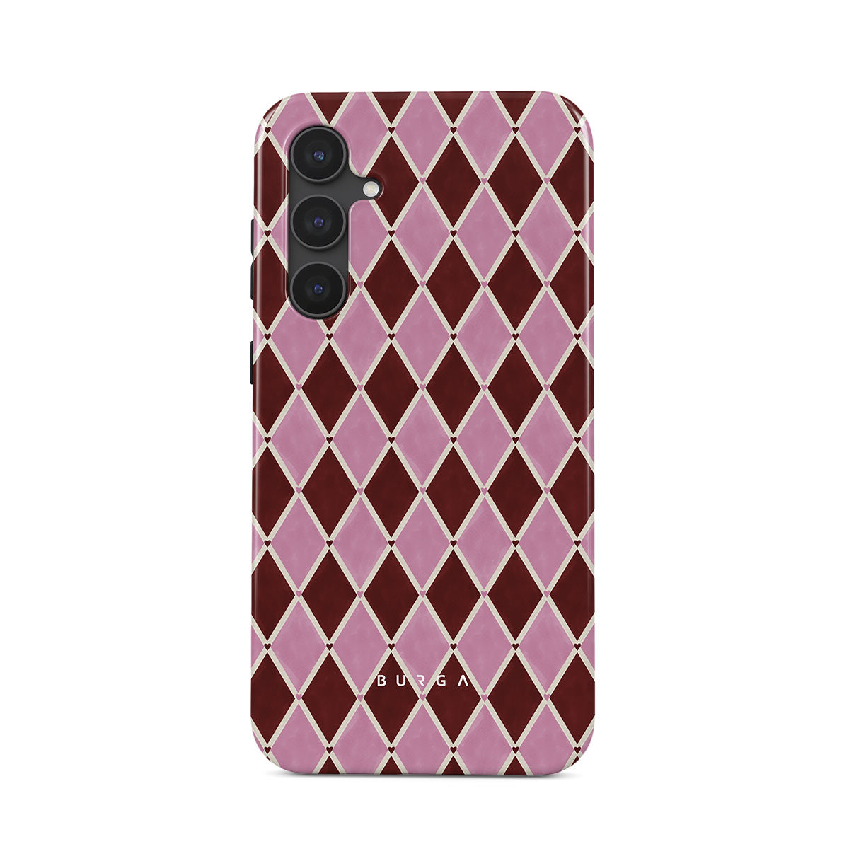 This design features: harlequin pattern, pink diamonds, deep red background