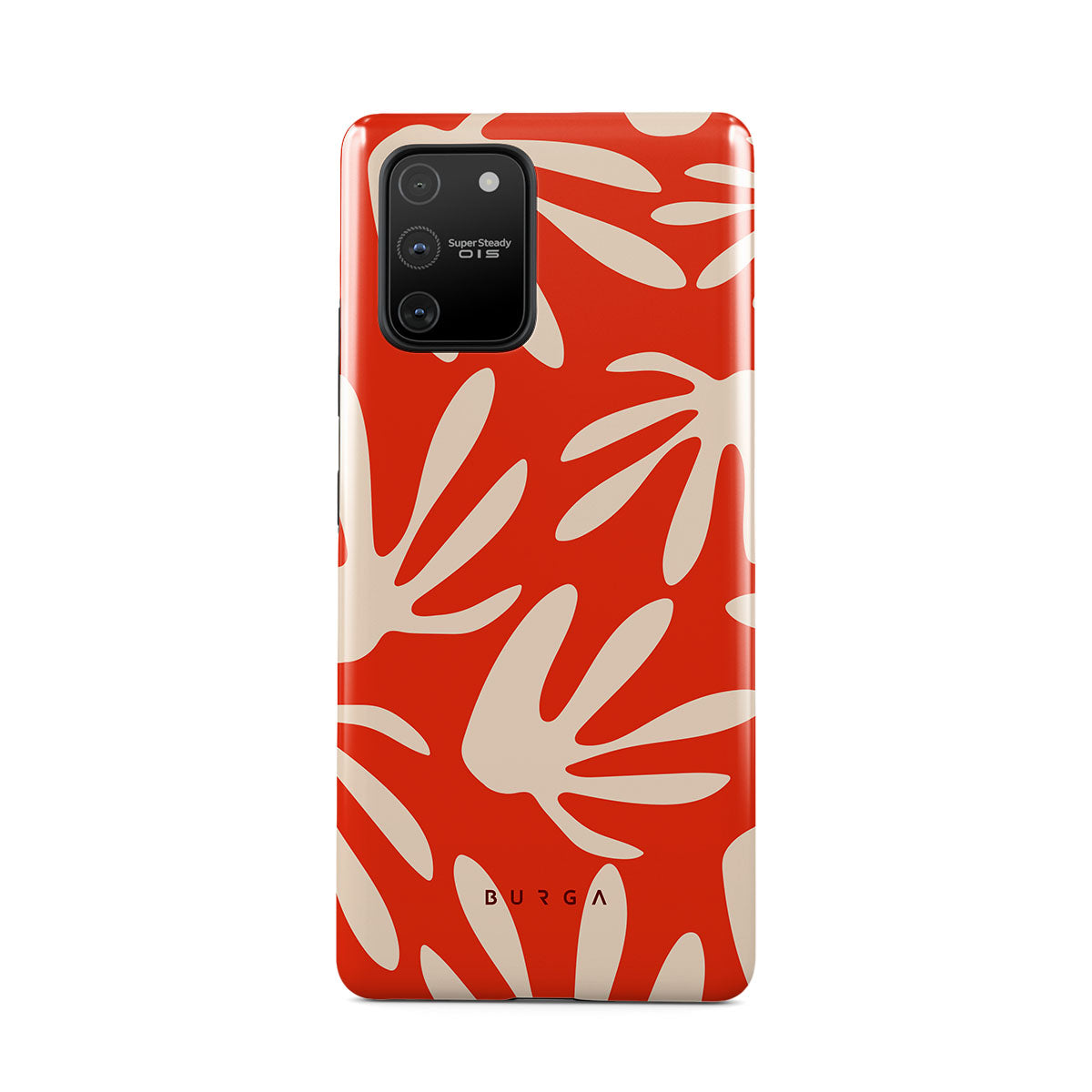 Unfolding the untamed allure of a summer sunset, this design boasts a vivid red background that sets your spirit of adventure aflame. Sprinkled across this fierce backdrop, lines of radiance dance playfully. Experience the warmth of passion and the sparkle of joy in the palm of your hand with our Heatwave Samsung Galaxy S10 Lite phone case.