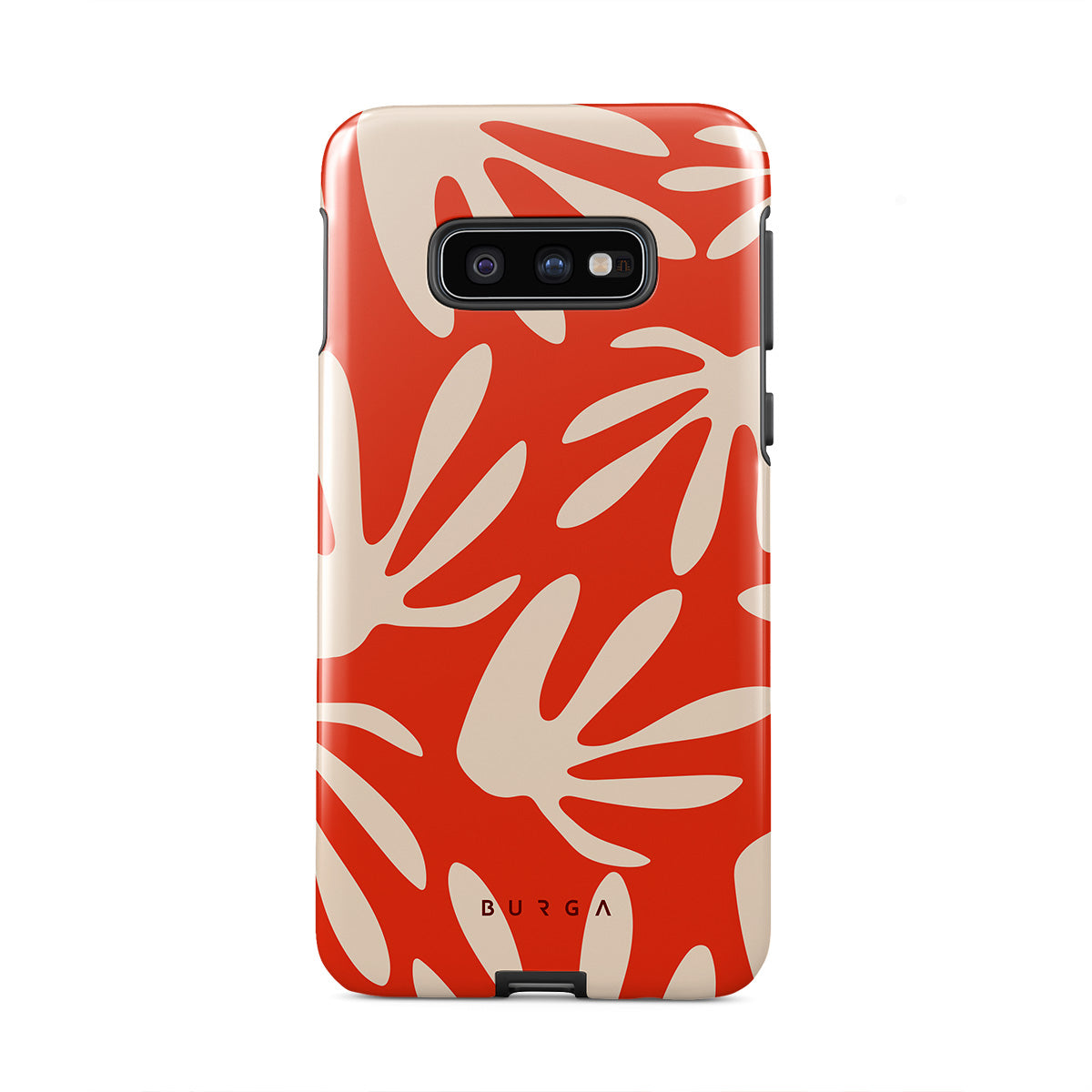 Unfolding the untamed allure of a summer sunset, this design boasts a vivid red background that sets your spirit of adventure aflame. Sprinkled across this fierce backdrop, lines of radiance dance playfully. Experience the warmth of passion and the sparkle of joy in the palm of your hand with our Heatwave Samsung Galaxy S10E phone case.
