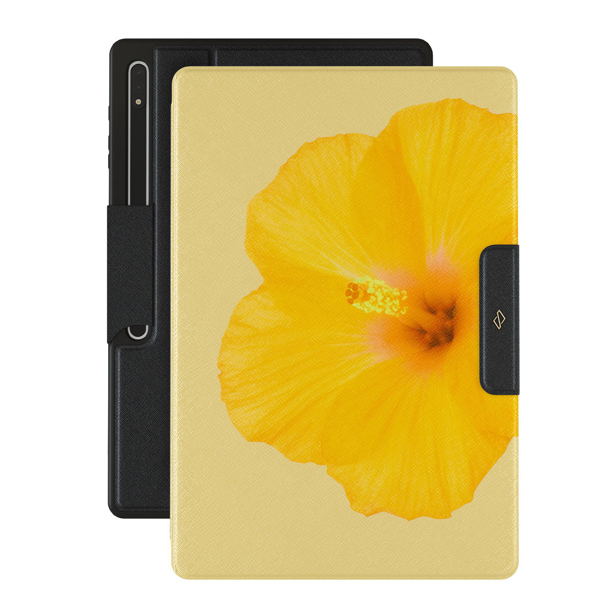 Our Hibiscus Samsung Galaxy Tab S8 Ultra folio case features a striking design with a large, vibrant yellow hibiscus flower on a matching yellow background. This tropical flower pattern exudes a sense of warmth and exotic beauty, perfect for those who love nature-inspired and floral aesthetics.