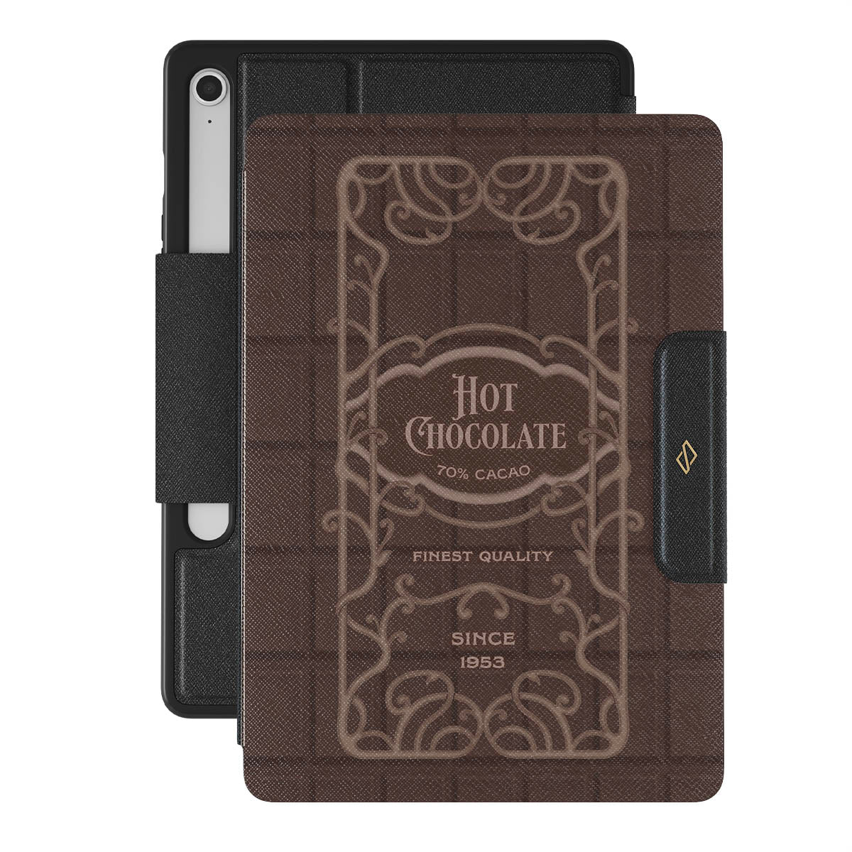 This design features: hot chocolate label, brown chocolate design, retro packaging style