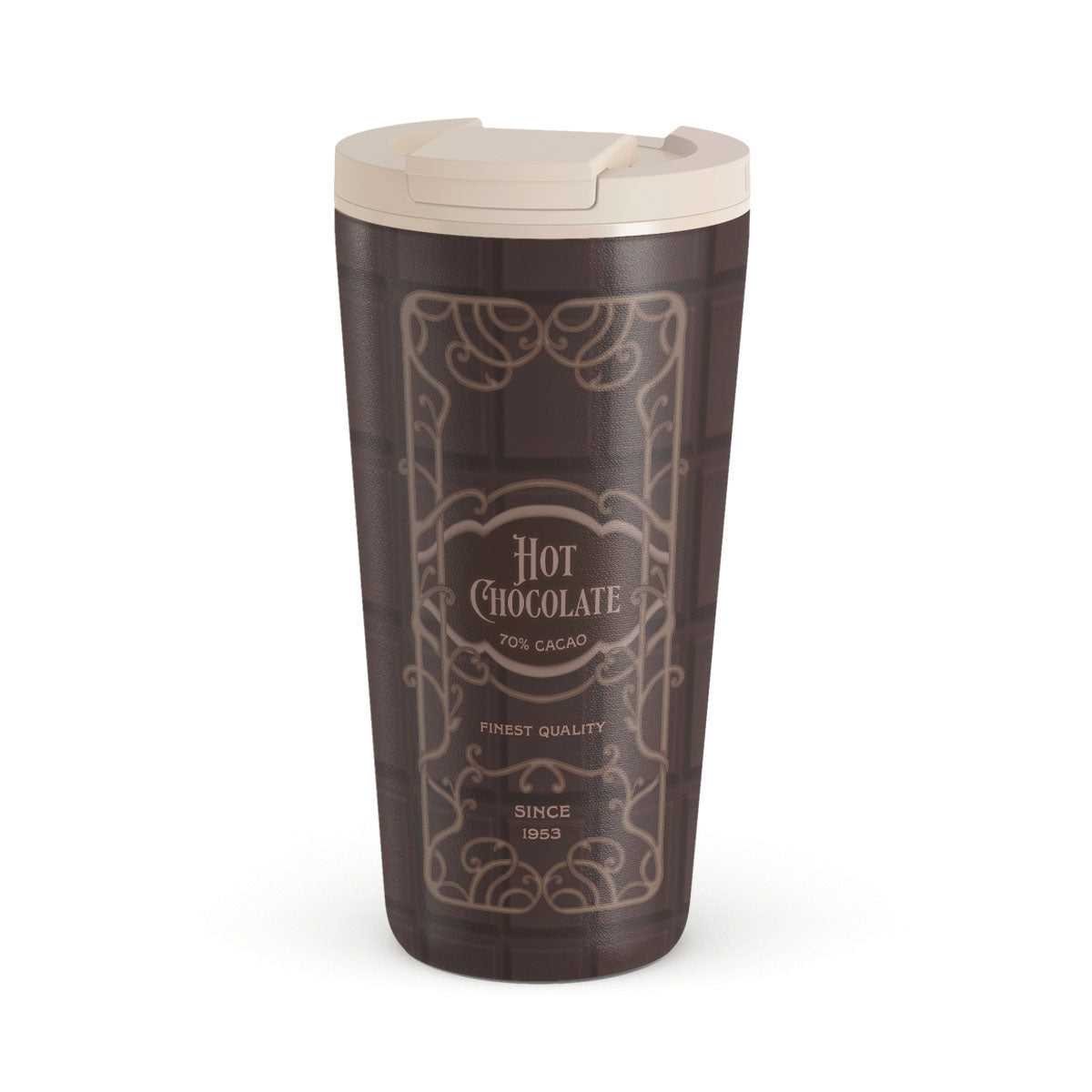 This design features: hot chocolate label, brown chocolate design, retro packaging style